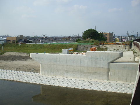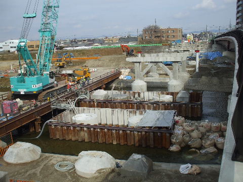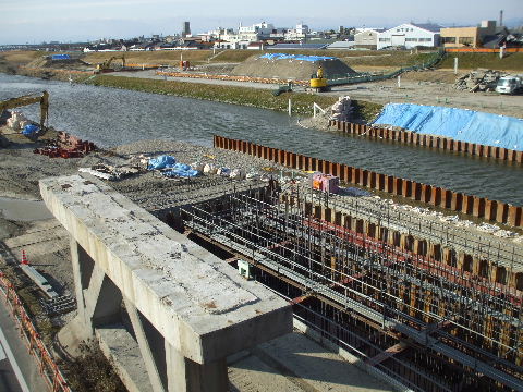 | 2009年3月20日。川の中の橋脚は完成し両岸の橋台の工事が始まっている。