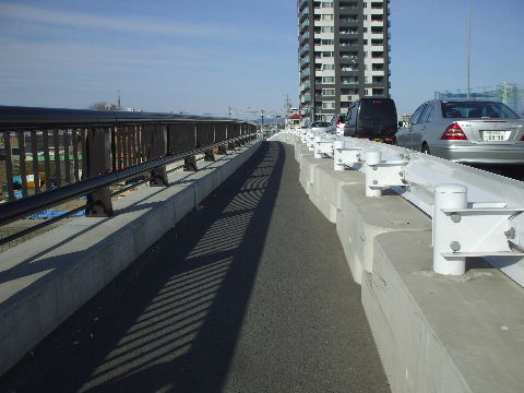 2013年3月3日。コンクリートの重石をしただけのガードレール。 車が当たる度に押され段々歩道が狭くなってきている様な気が する。新しい橋が出来る頃には歩道がなくなっていたりして。 |