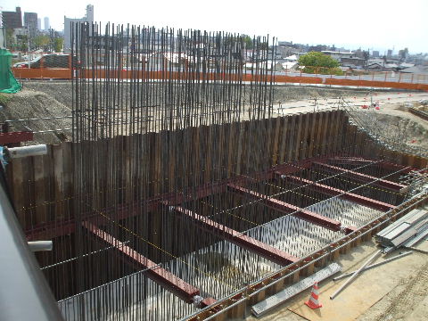 | 2014年4月12日。南側橋台。基礎の上に鉄筋が立ち始めている。 |