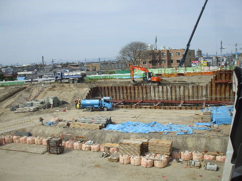 | 2012年3月25日。黒川方面から来る道路用の橋台と上飯田方面から来る立体交差道路用の橋脚が一本だけ出来ている。 |