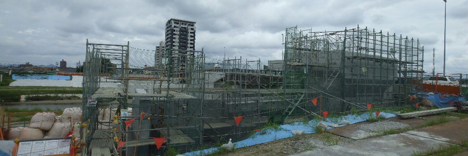 | 2016年09月17日。堤防手前から黒川方向を見る。向こうから三階橋に向かってあがってくる。擁壁が出来て土を入れているところか。 |