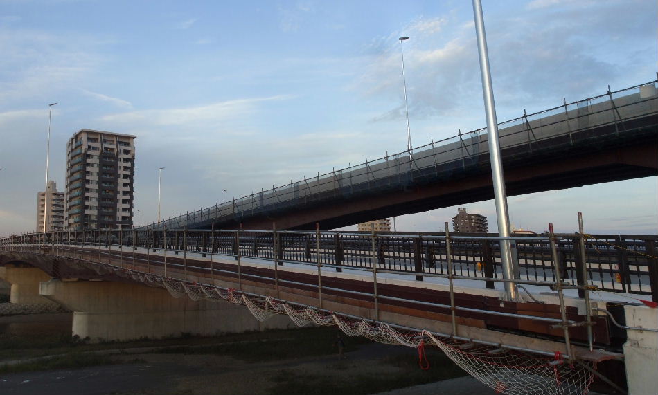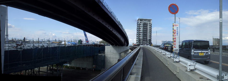 2016年10月30日。先に出来ていた橋の三車線のうち二車線を上下 車に、一車線を歩道に使っていたのを南行き三車線化する工事が 始まり橋の西側の歩道が閉鎖されている。 |