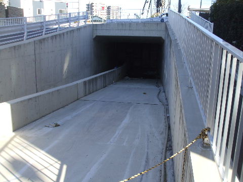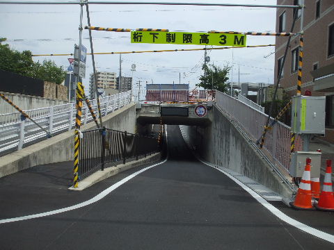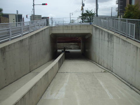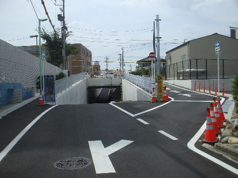 2018年08月19日。堤防の一筋北に作っていた道路を横断する地下 道が開通している。車道は東行きの一方通行。西から見る。 |