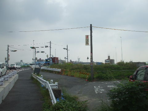 2018年08月19日。東から見る。堤防の信号交差点がなくなった代 わりかと思われるが堤防交差点跡には何の表示もしてないので不 親切。堤防道路からは遠くの信号交差点しか見えないので無理に ガードレールをまたいで渡ろうとする人もいるだろう。 |