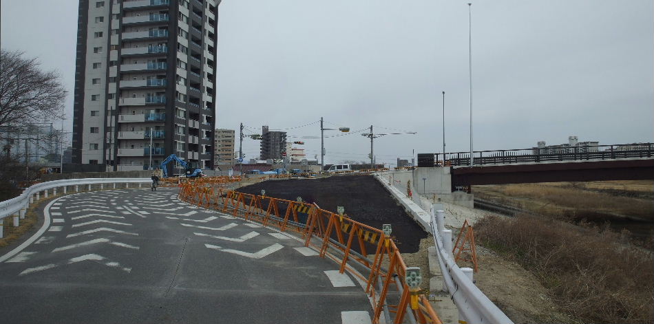 | 2017年03月05日。まっすぐ橋へつながる車道が出来てきた。あとは舗装。 |