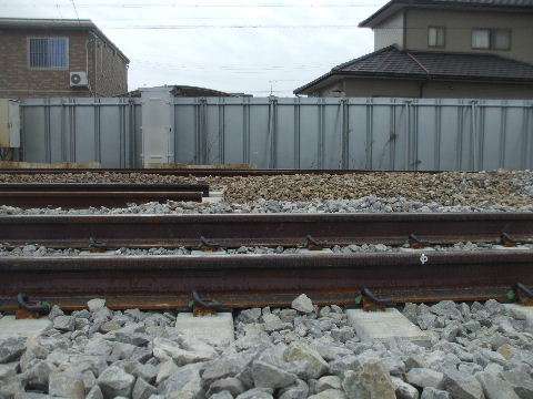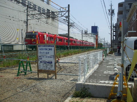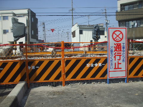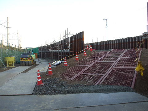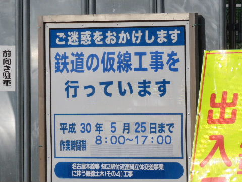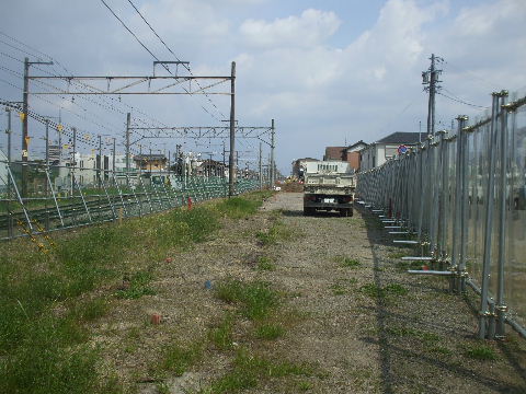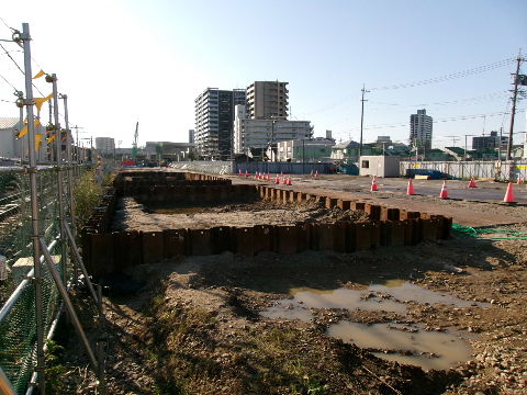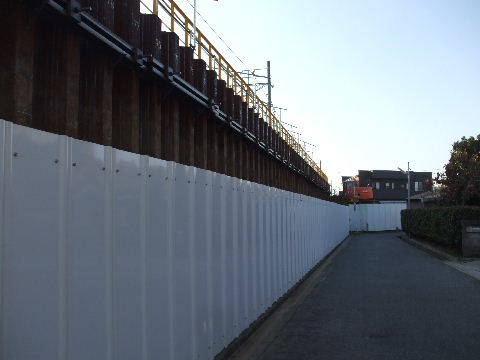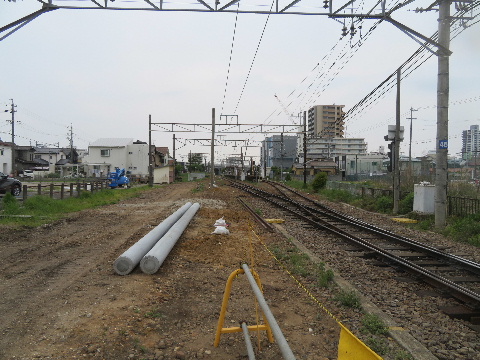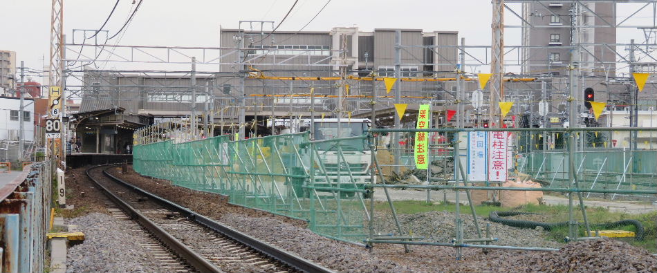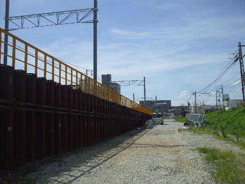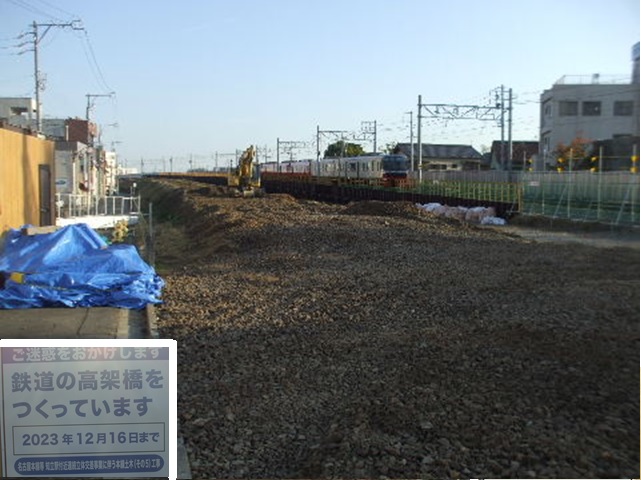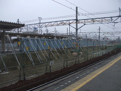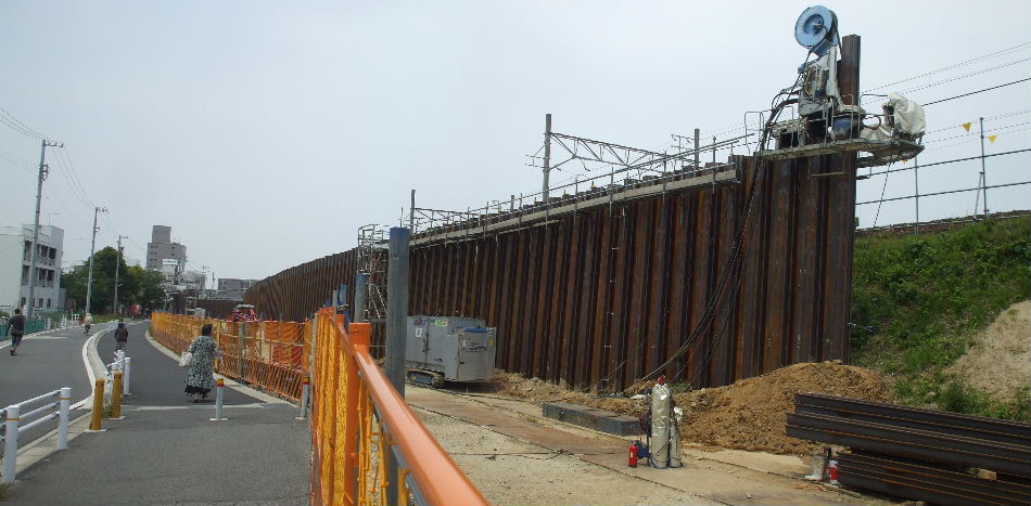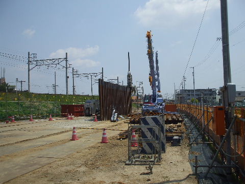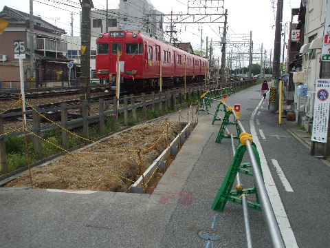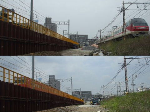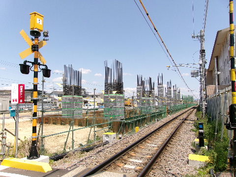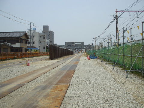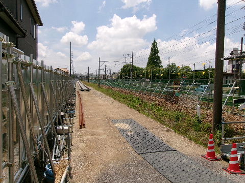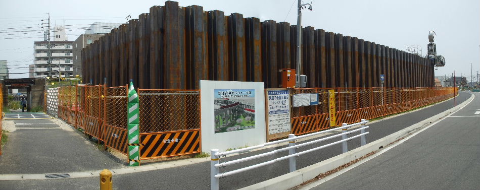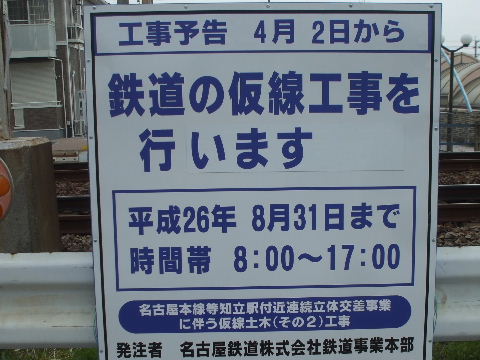 | 2014年3月29日。駅より名古屋寄りの区間に工事予告看板立つ。 | 2014年4月26日。工事始まる。少し築堤になっているので同じ高さ の矢板を打ち込んで仮線の路盤つくり中。 |