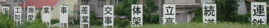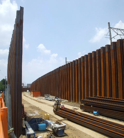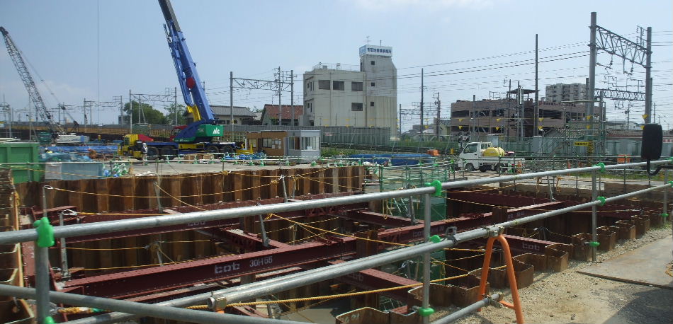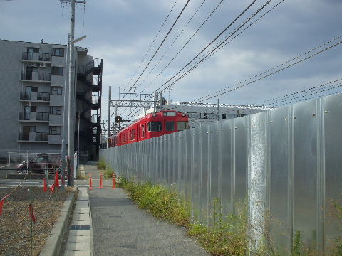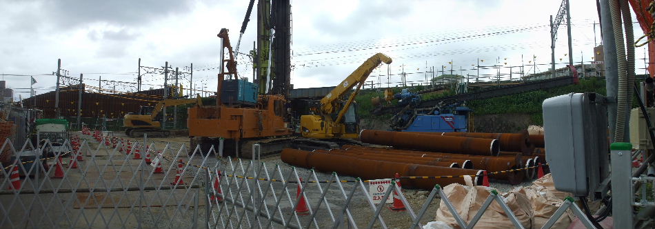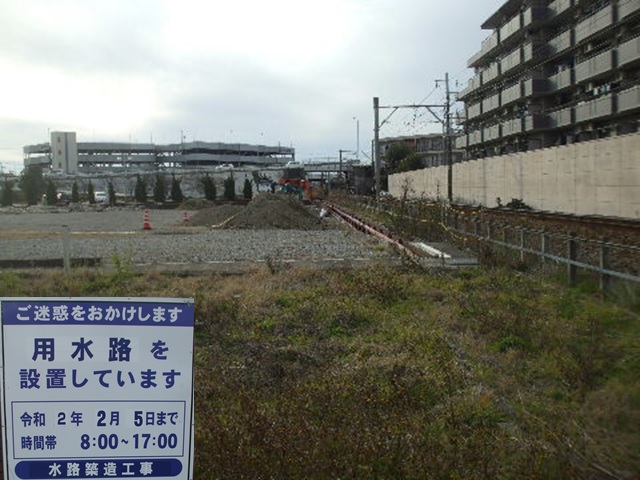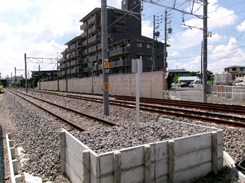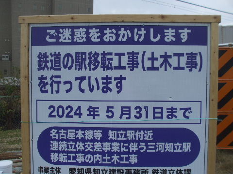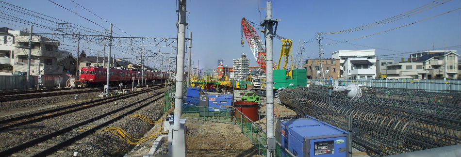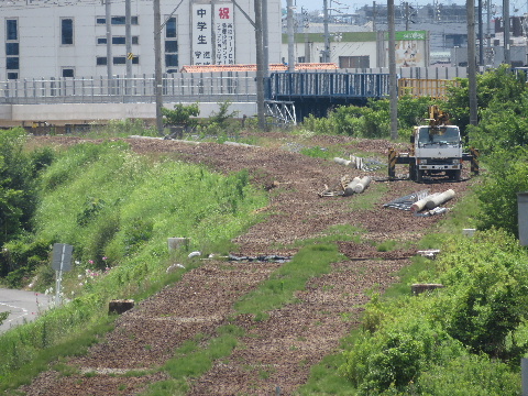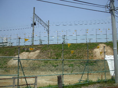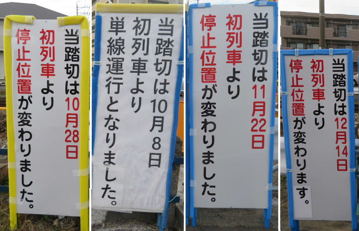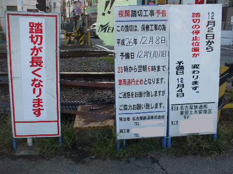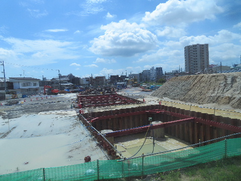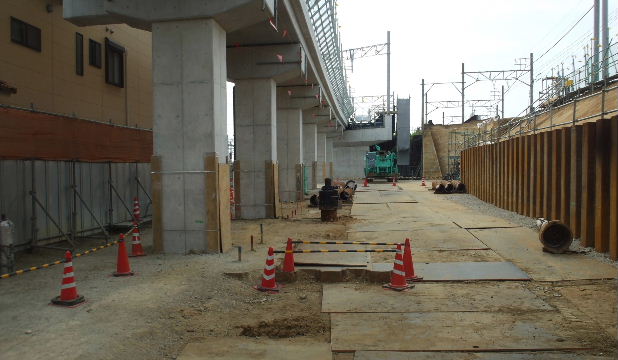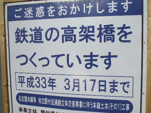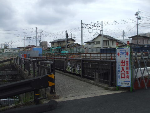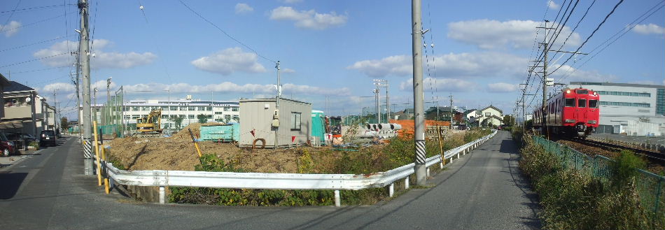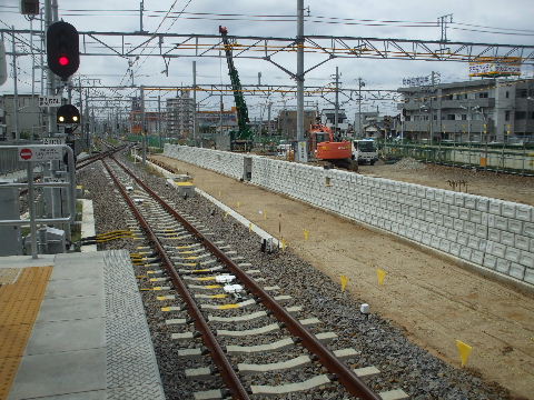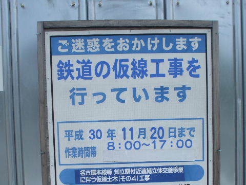 | 2014年3月29日。駅より名古屋寄りの区間に工事予告看板立つ。 | 2014年4月26日。工事始まる。少し築堤になっているので同じ高さ の矢板を打ち込んで仮線の路盤つくり中。 |