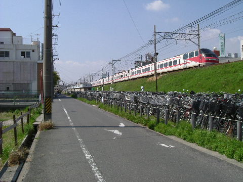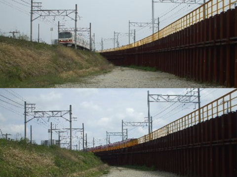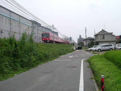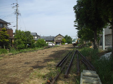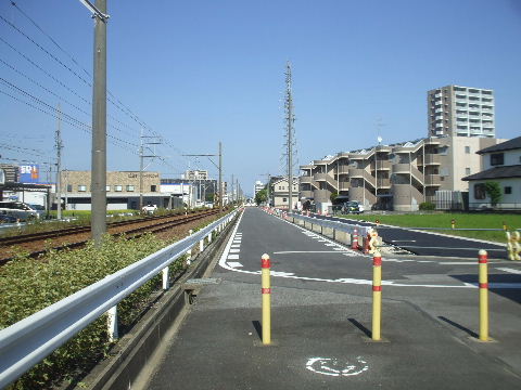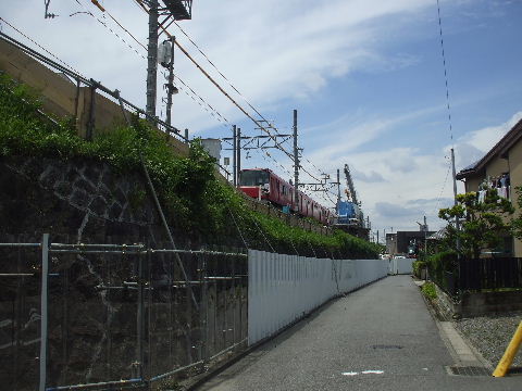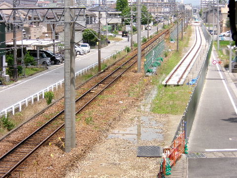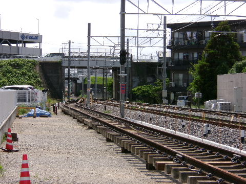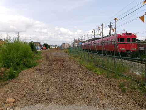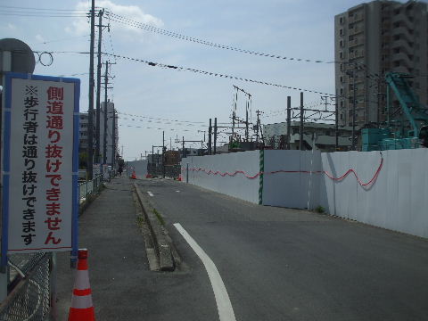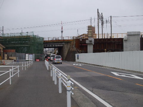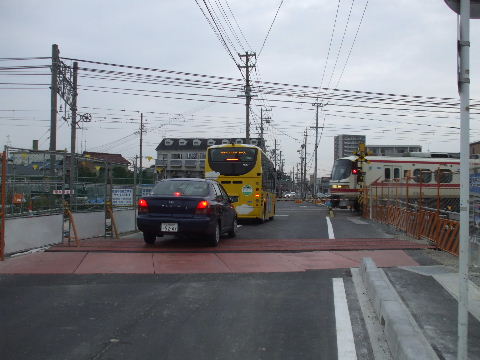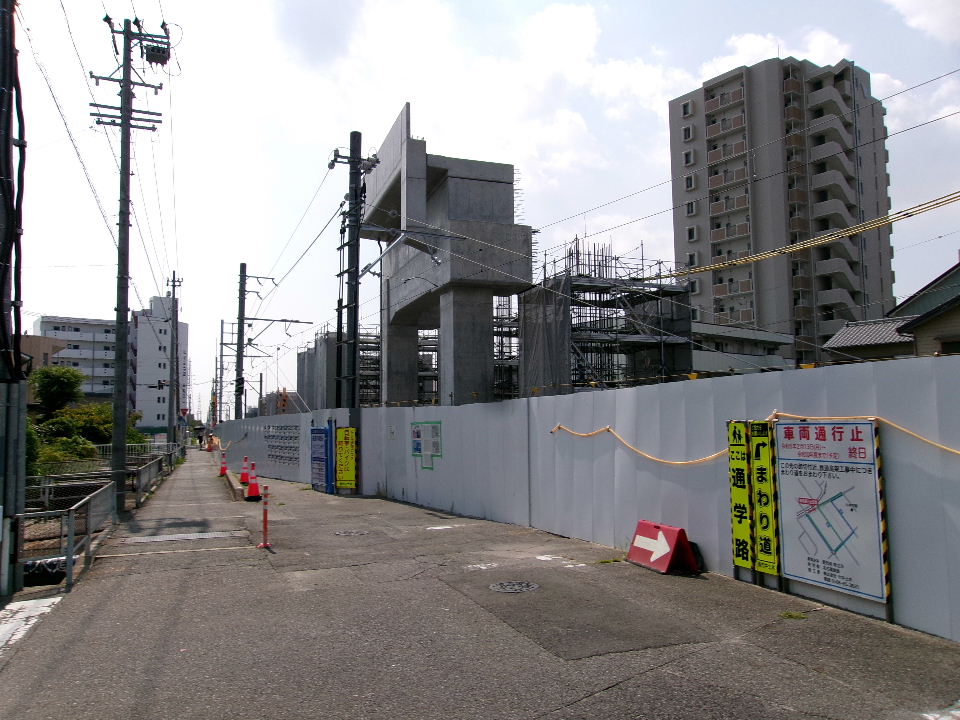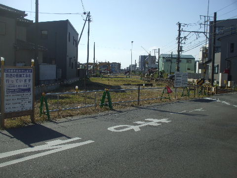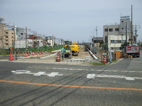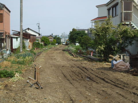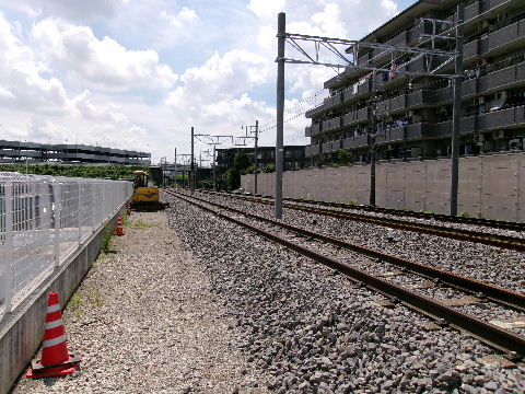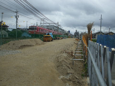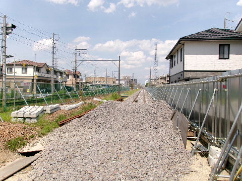 | 2007年8月4日 先に見える車の向うで仮線用地が確保されており、その先は線路沿いの道路が使われるようだ。 | 2010年9月11日 線路に沿った道から少し離れて仮線分空けた位置に仮道路を造っている。 |