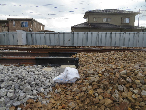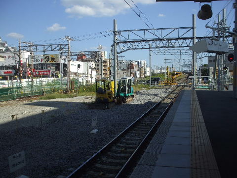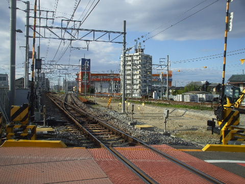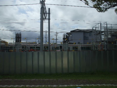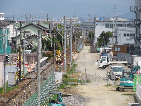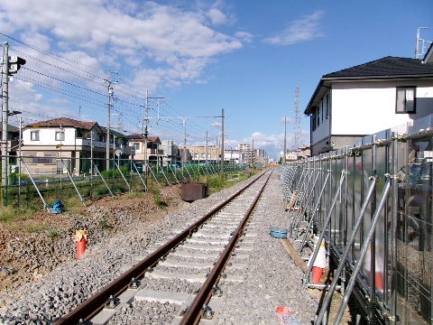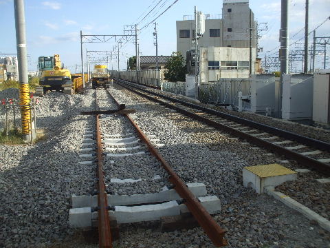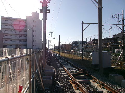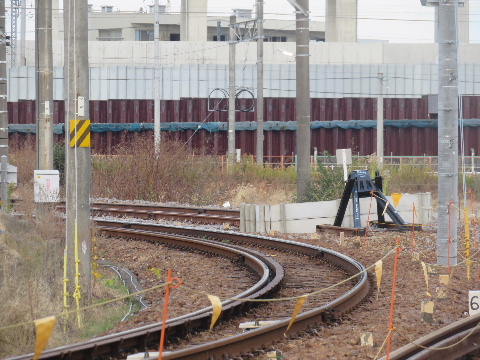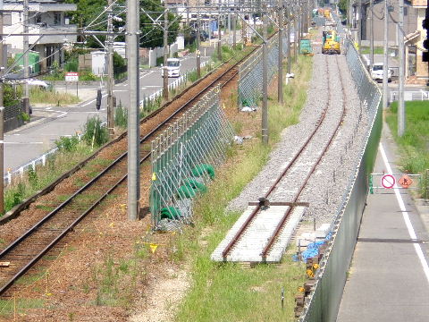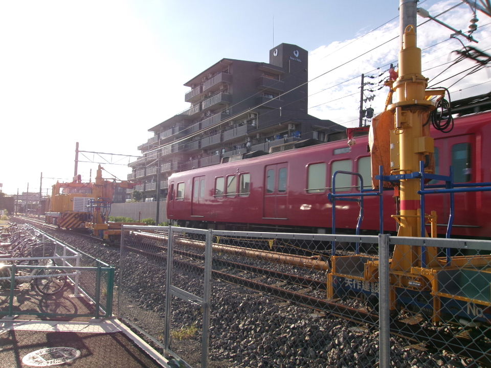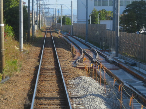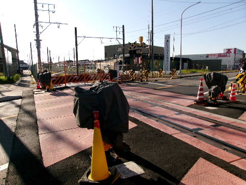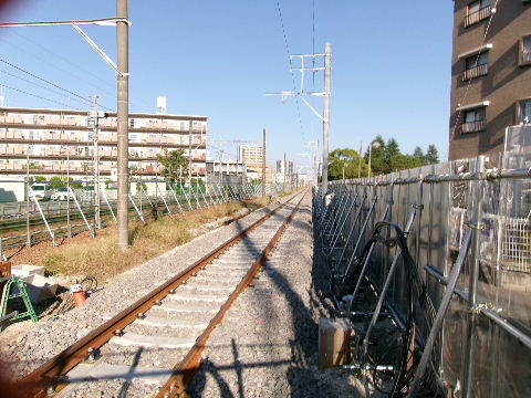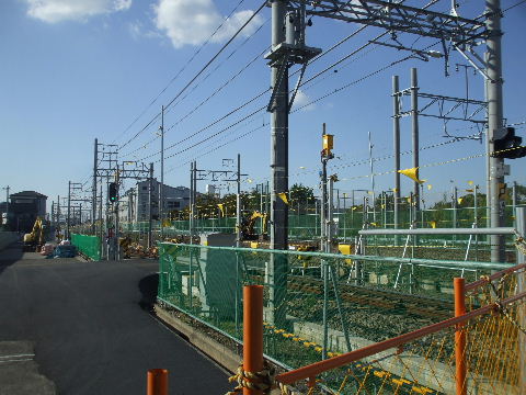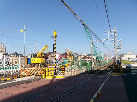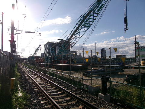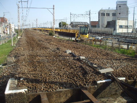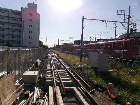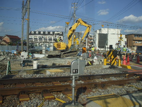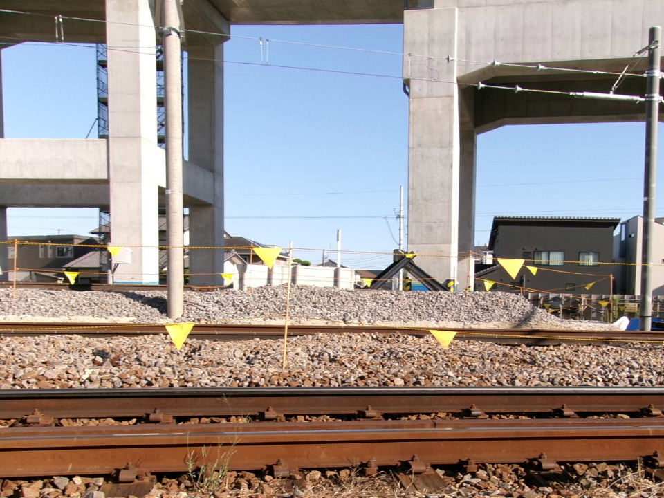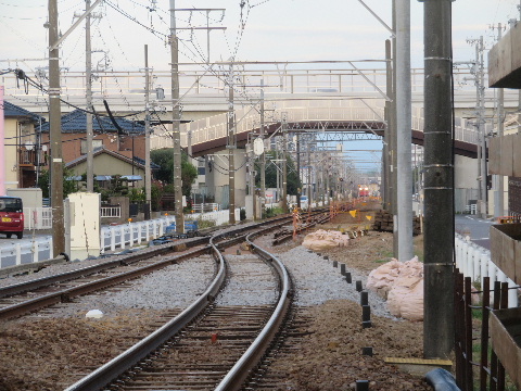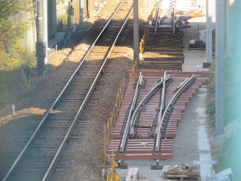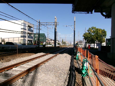 | 2015年10月04日。仮線が出来たあと、初めて電車が通っているの を見た。回送電車がゆっくり一つ木方向へ走って行った。 |