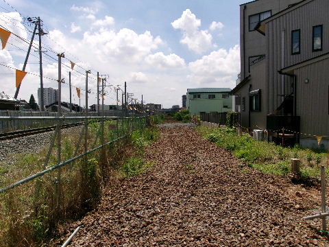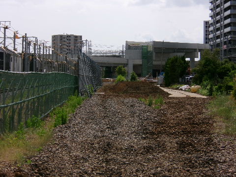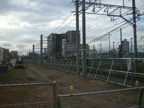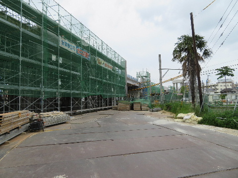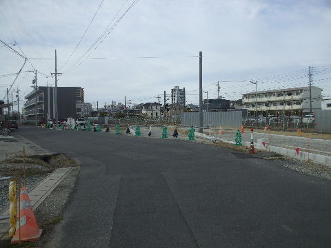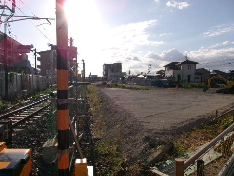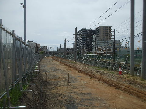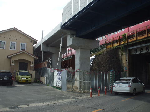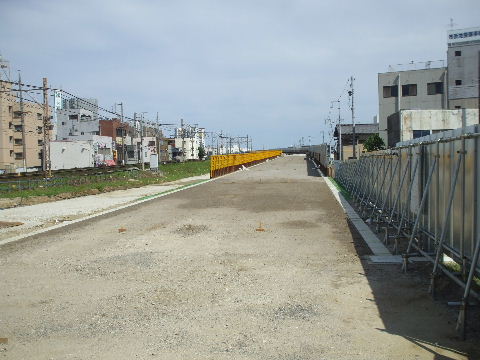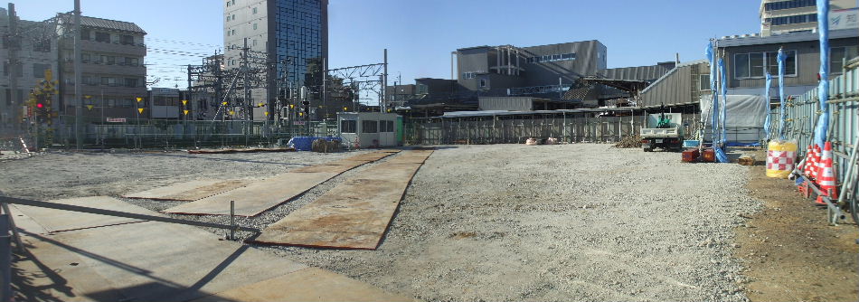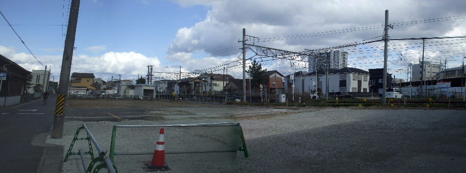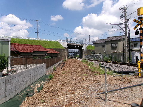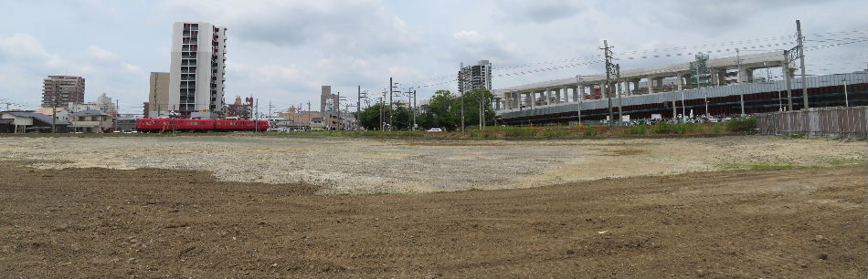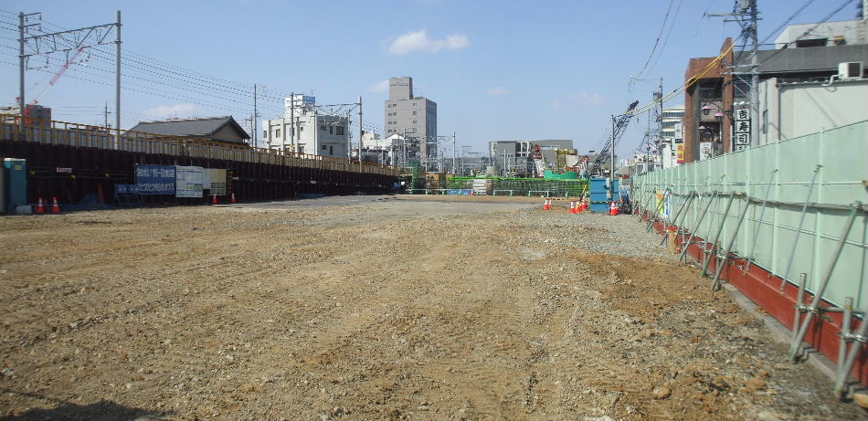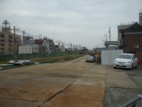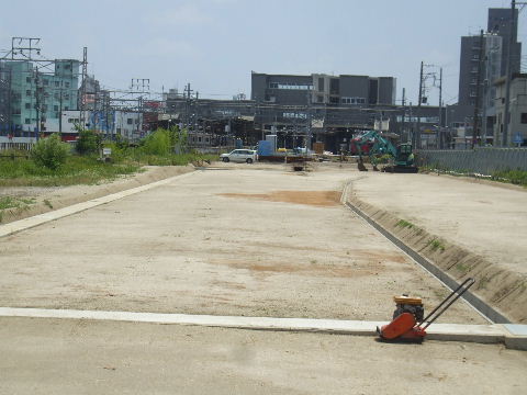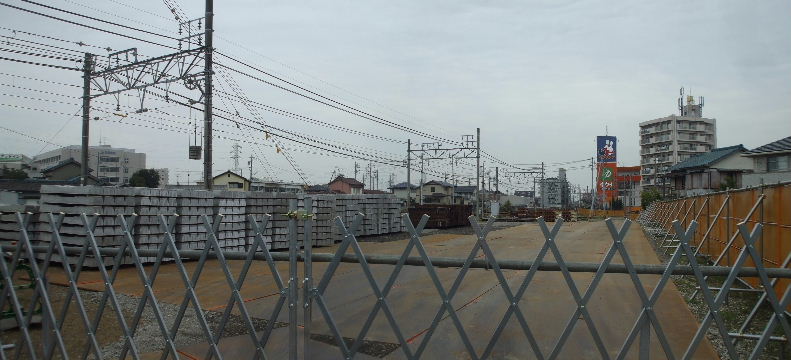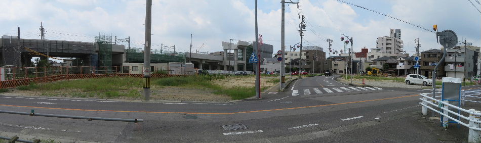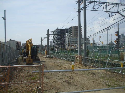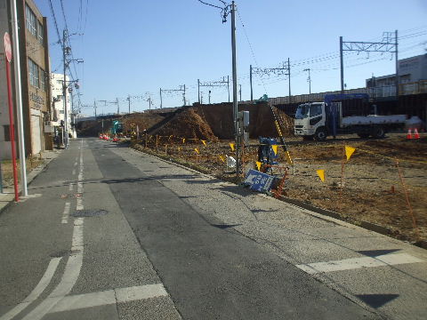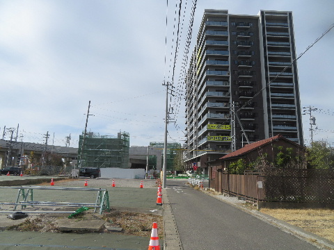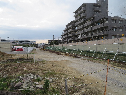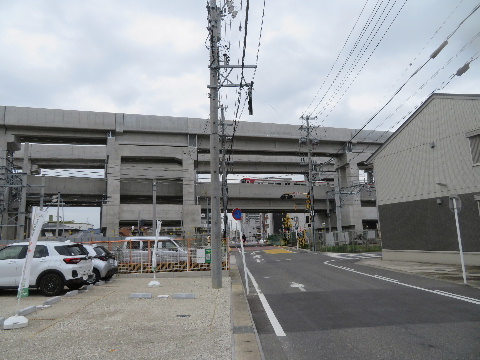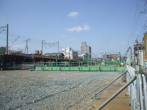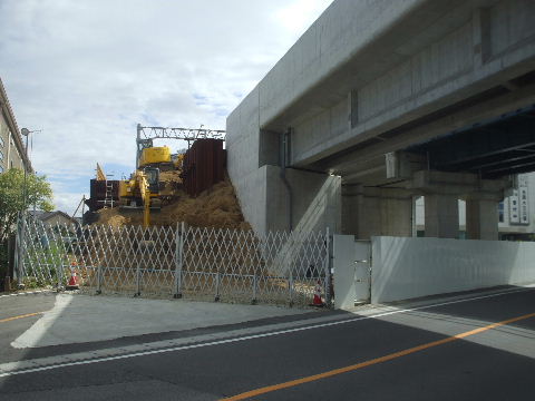 | 2022年04月23日。北東側の建物が立ち退いて広く空いていた所、区画して宅地造成中。奥に高架橋が見える。 |