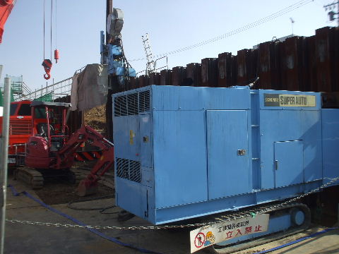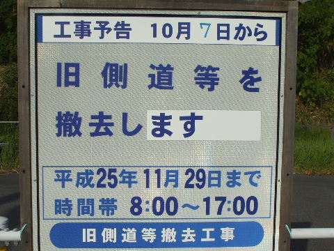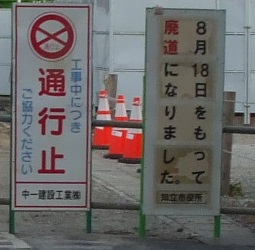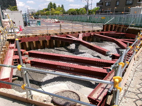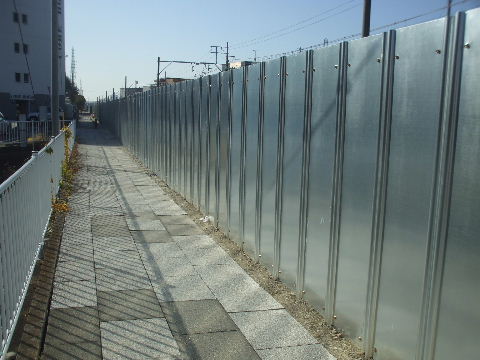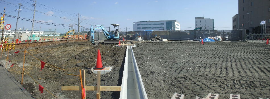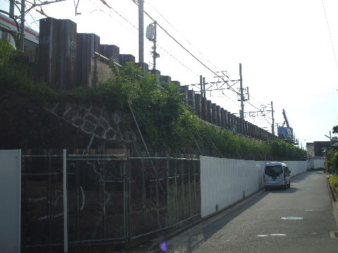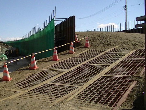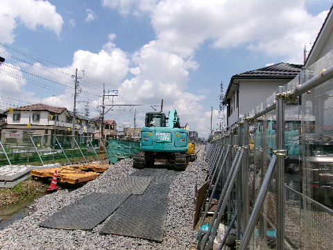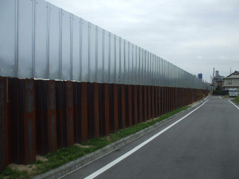 | 2014年8月3日。土入れが終わり、側溝の工事中。 | 2014年9月20日。矢板の上に塀が追加され何も見えなくなった。 |