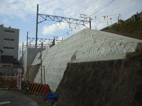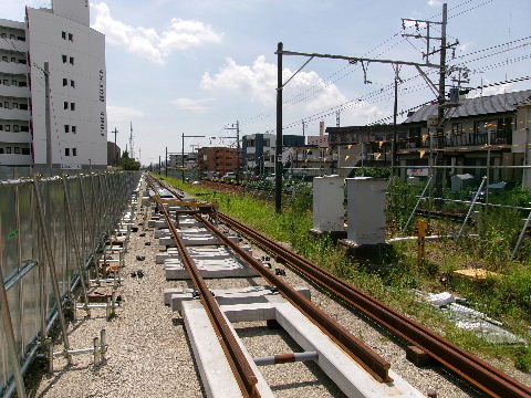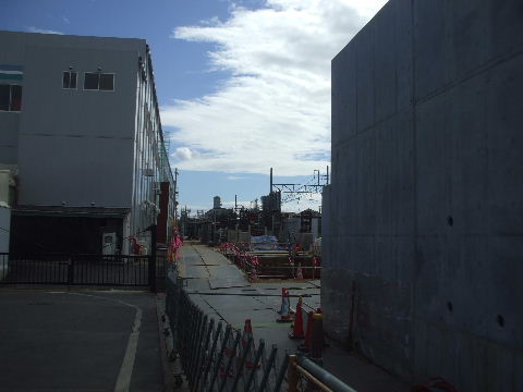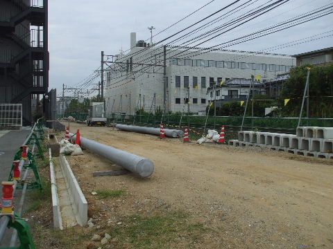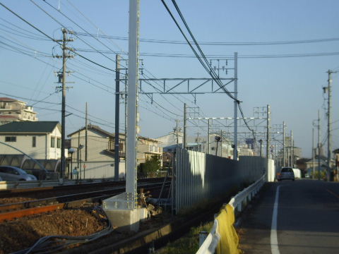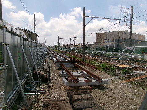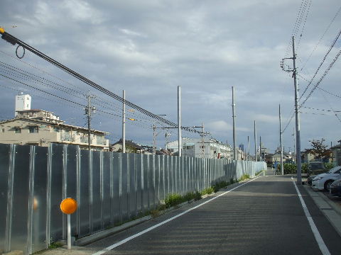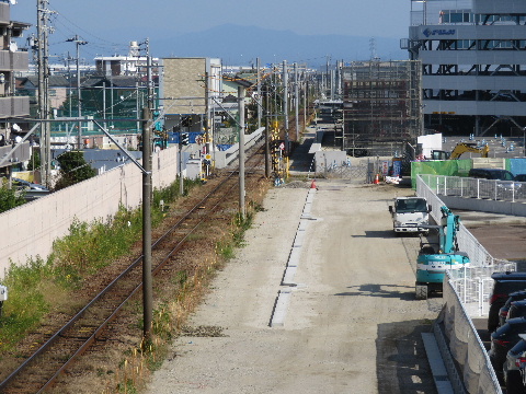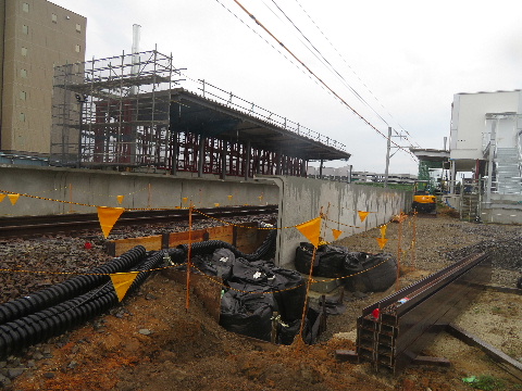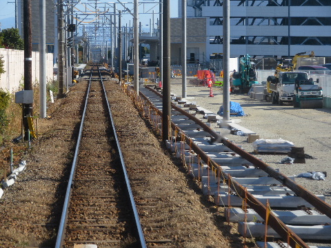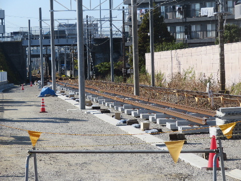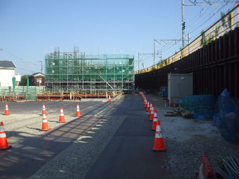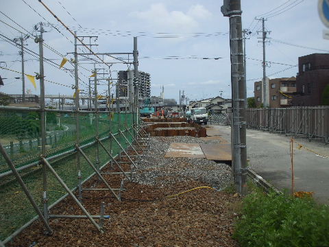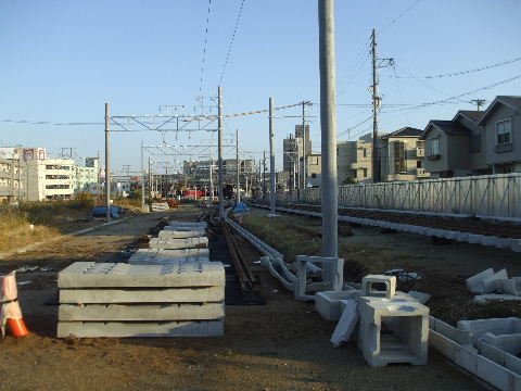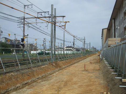 | 2014年9月20日。資材搬入され、側溝など工事中。 | 2014年10月26日。仮線に移る部分。仮線位置まで広げて仮線側に 金属製の架線柱立つ。 |