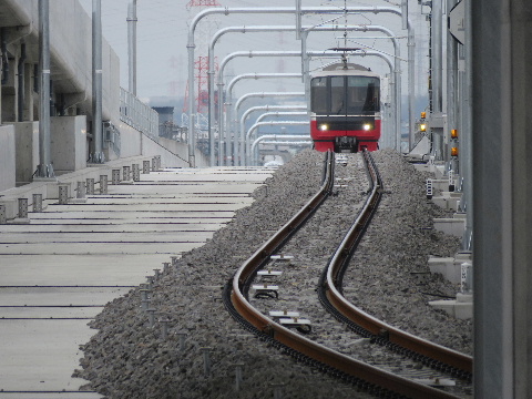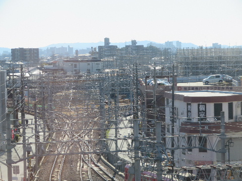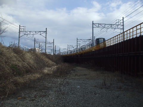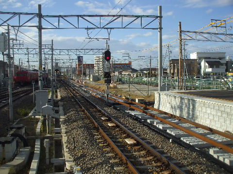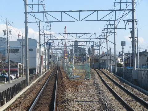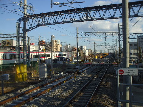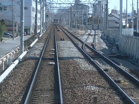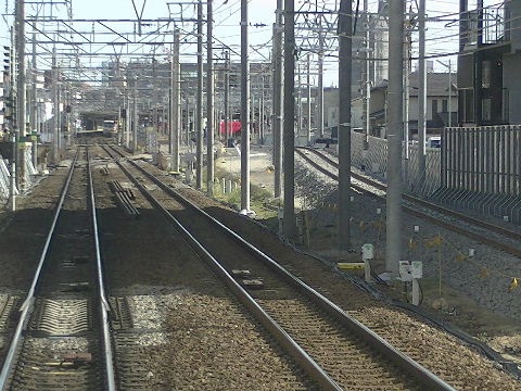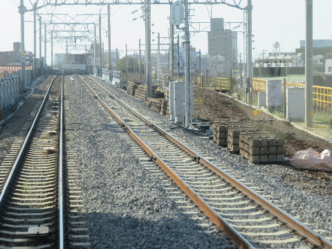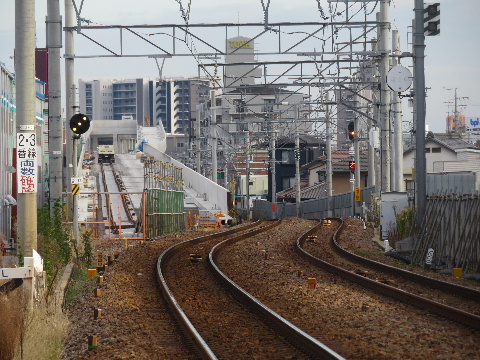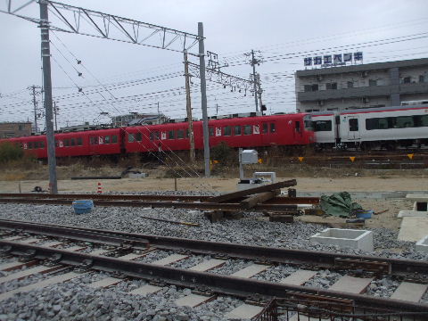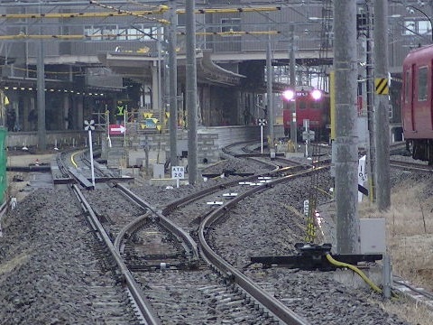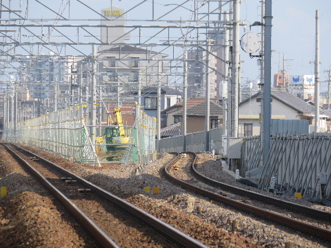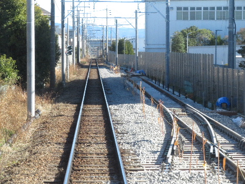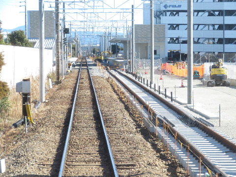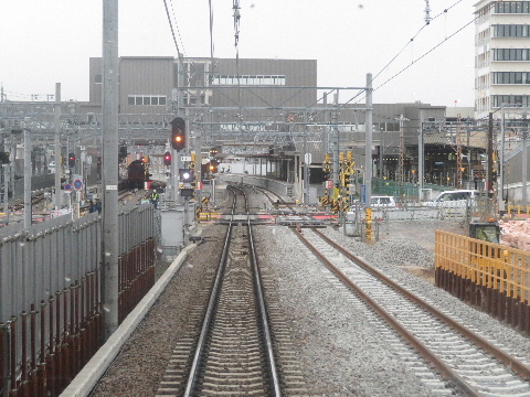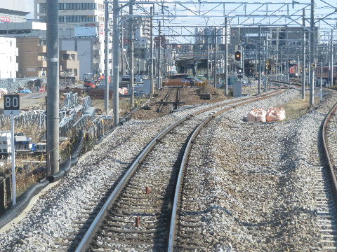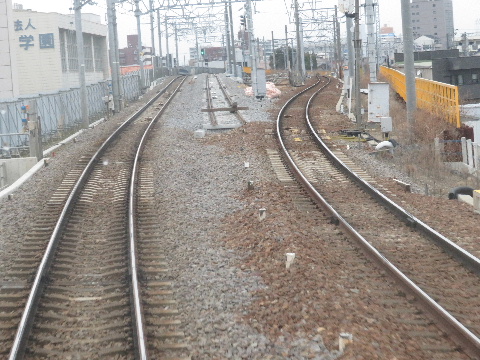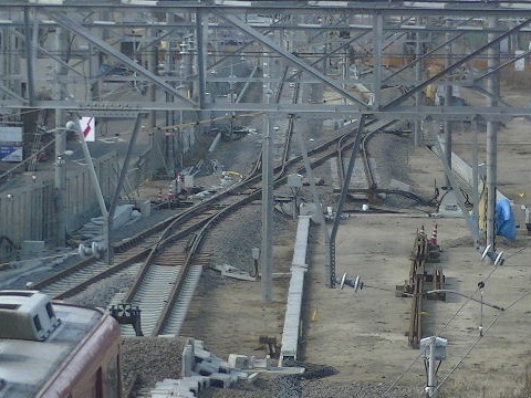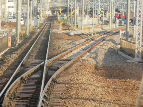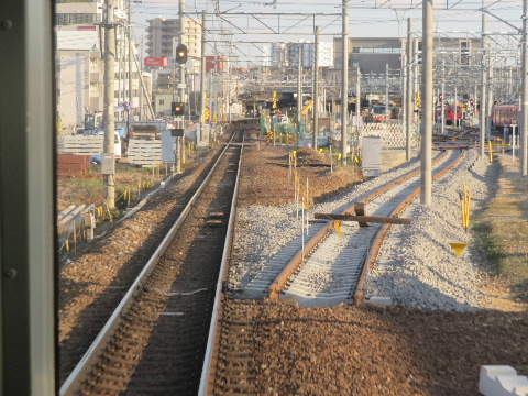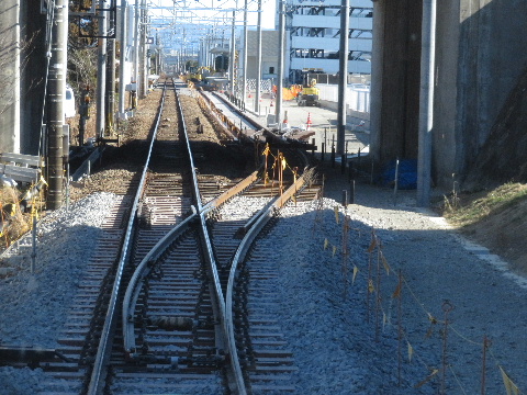 | 2018年01月13日。上り車内から。長い渡り線の向こうに並行して 新しく線路が敷かれているのが見える。 |