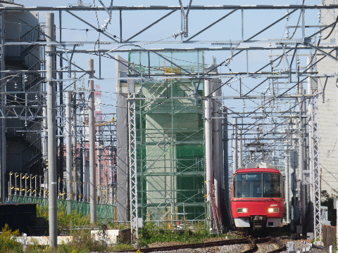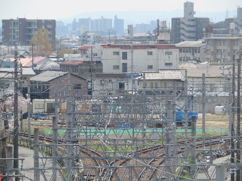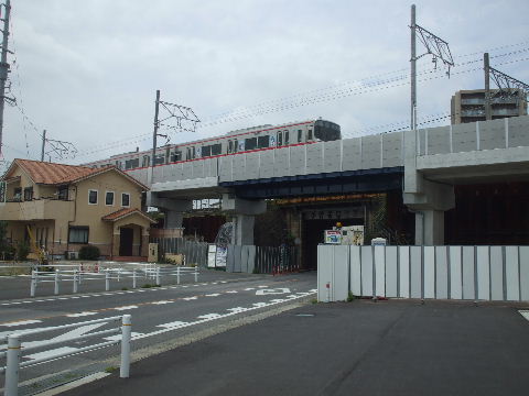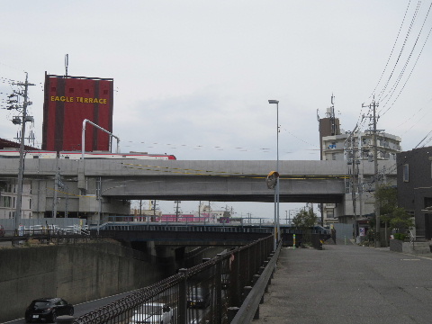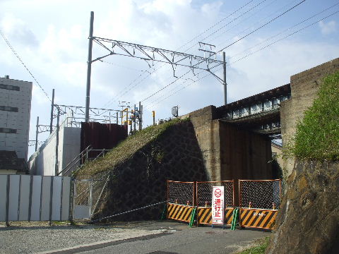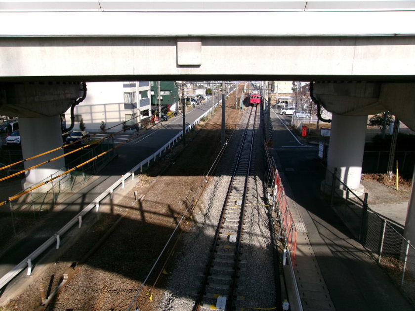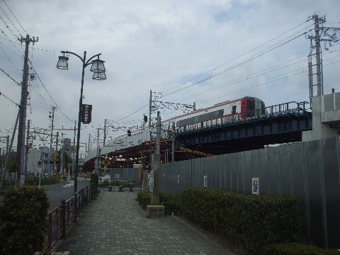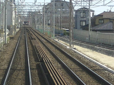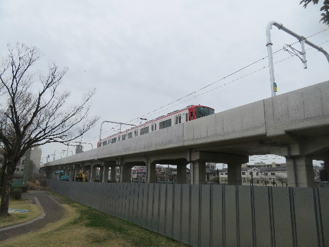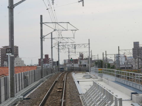 | 2020年03月29日。ちょうど高架橋の縁の下に上り仮線の架線が通 っているので車両半分が高架橋の下ということになる。 |