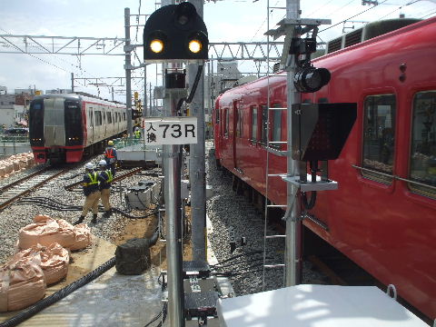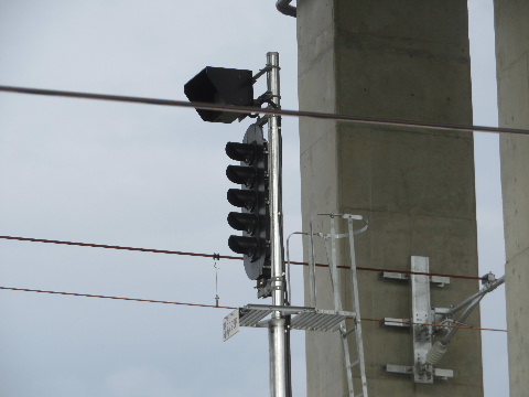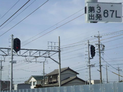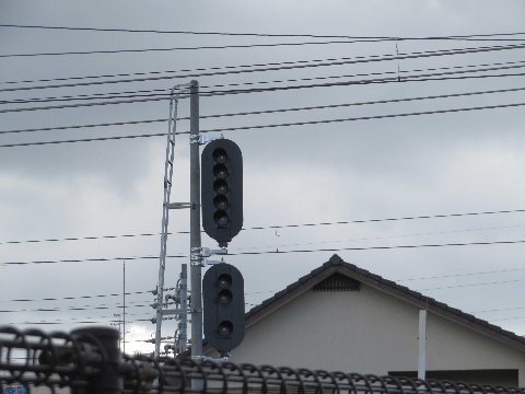 | 2020年02月23日。国道155号線脇に設置された上り仮線用の場内 信号機。本線用の5灯と三河線入る用の1灯目潰しの3灯信号機が 線路と直角方向を向いている。 |