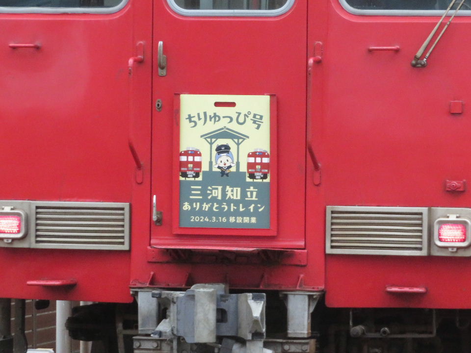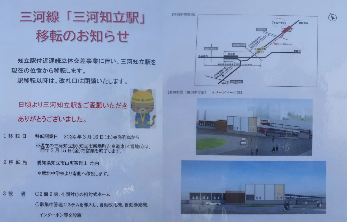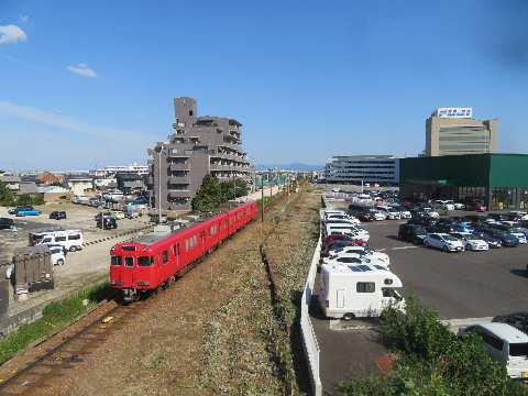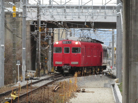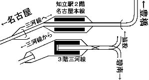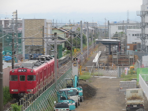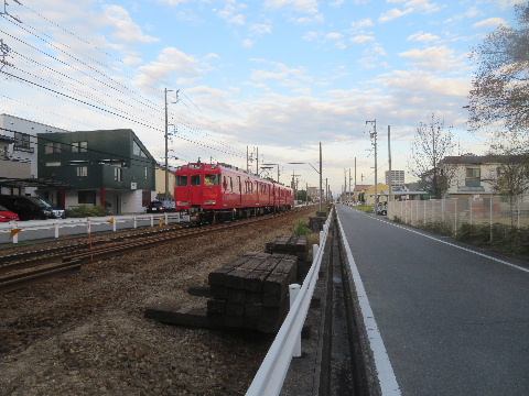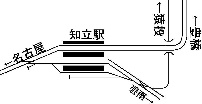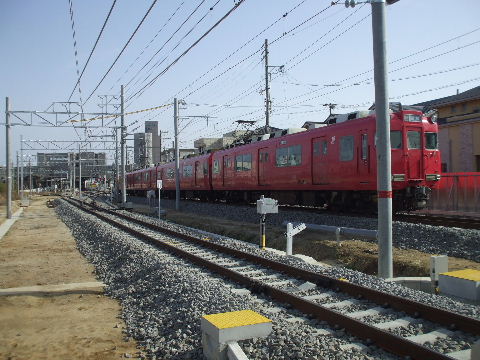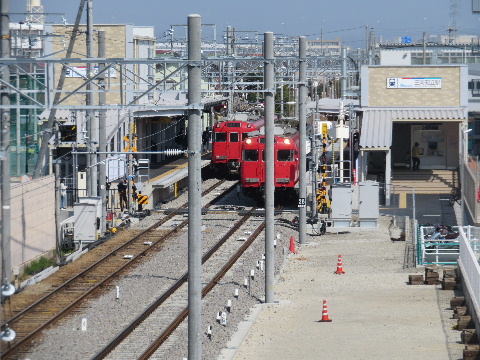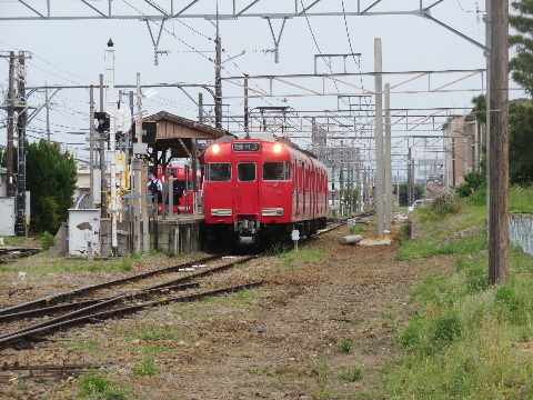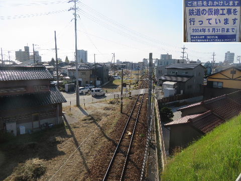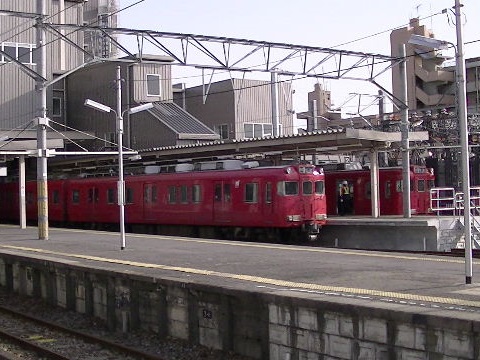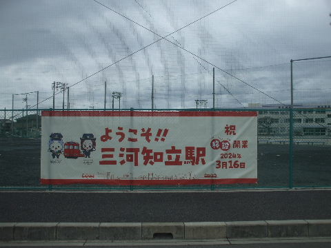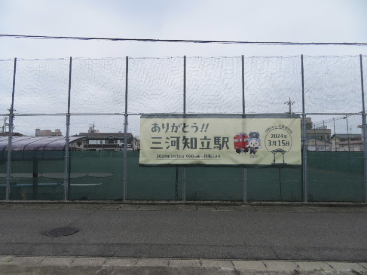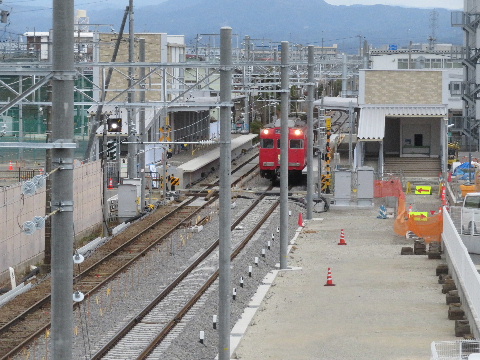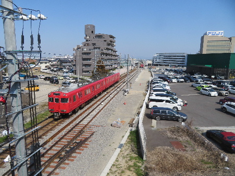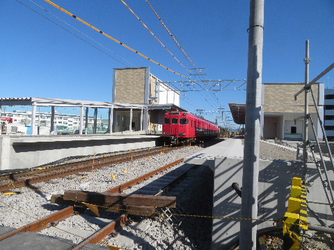 | 2024年03月16日。国道一号線から。猿投方面 接近中。知立方面停車中。旧駅では猿投行きが 先に到着していたが駅が三河八橋に近づいたので 新駅では知立行きが先に到着する。 |