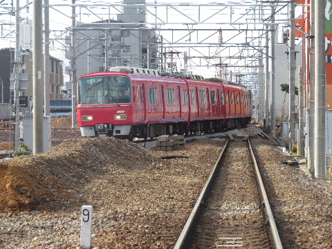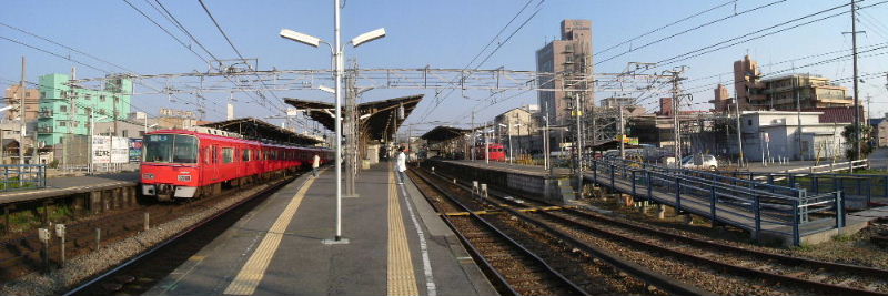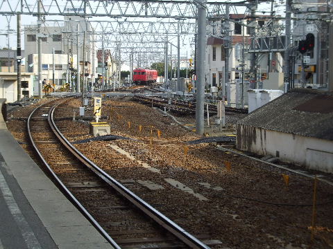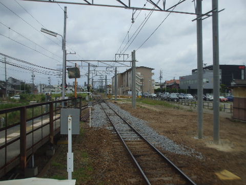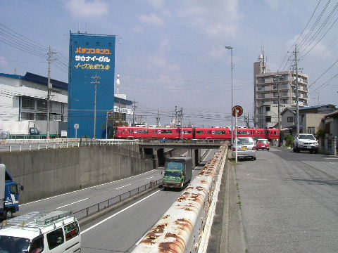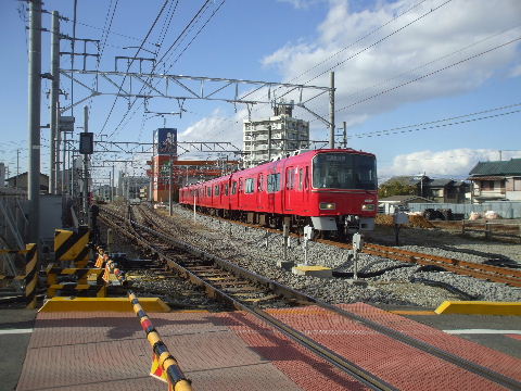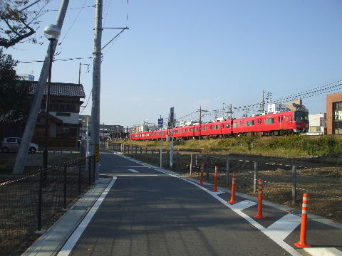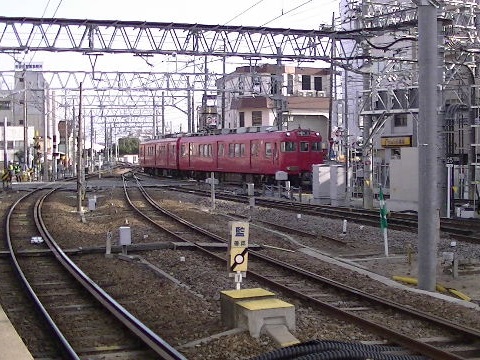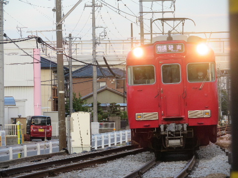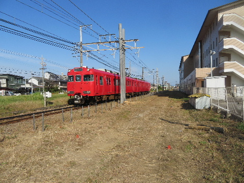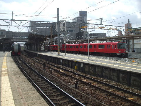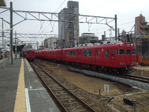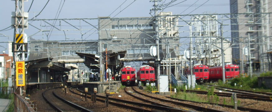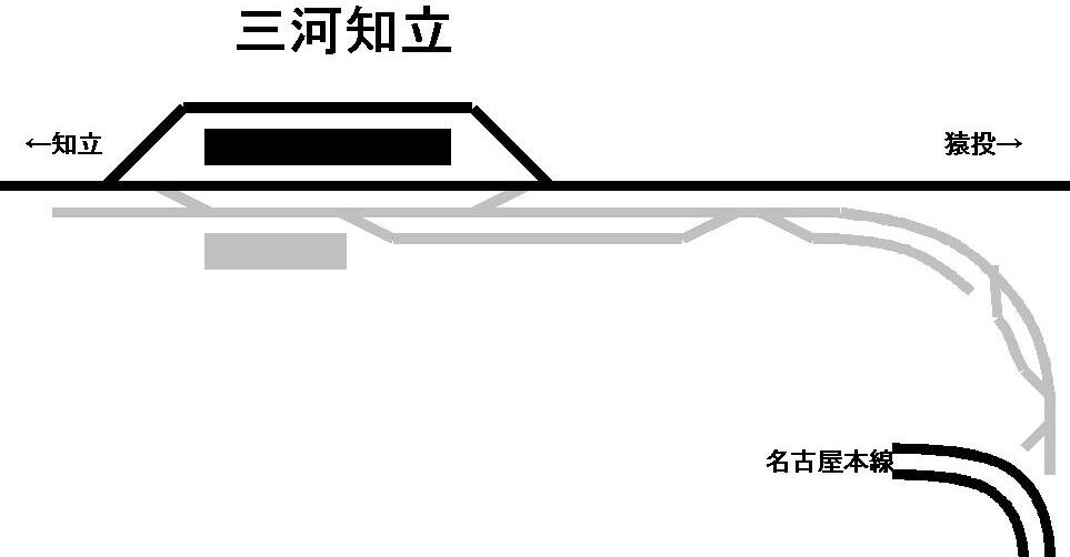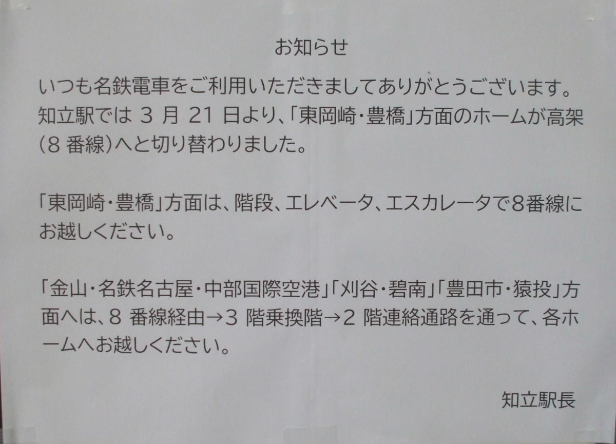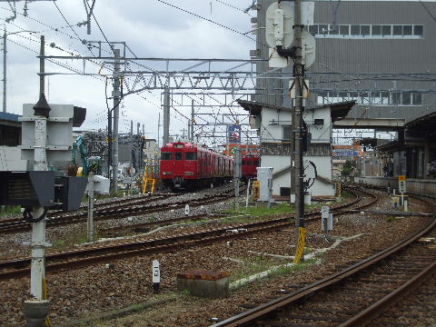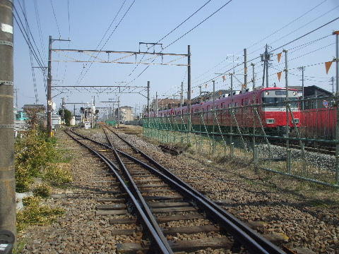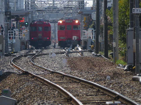 | 2024年03月16日。国道一号線から。猿投方面 接近中。知立方面停車中。旧駅では猿投行きが 先に到着していたが駅が三河八橋に近づいたので 新駅では知立行きが先に到着する。 |