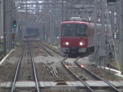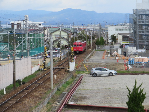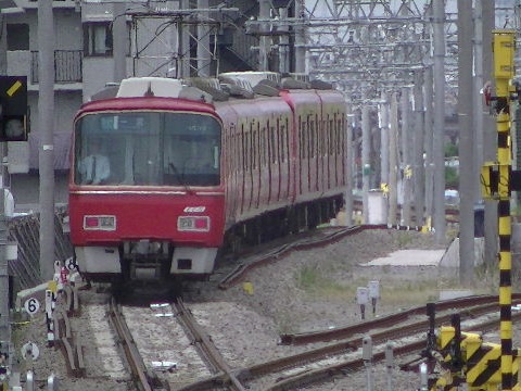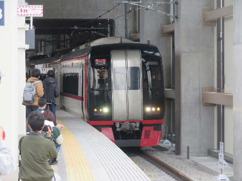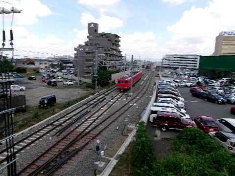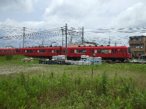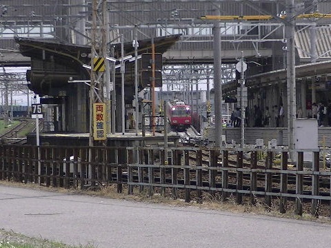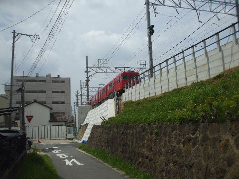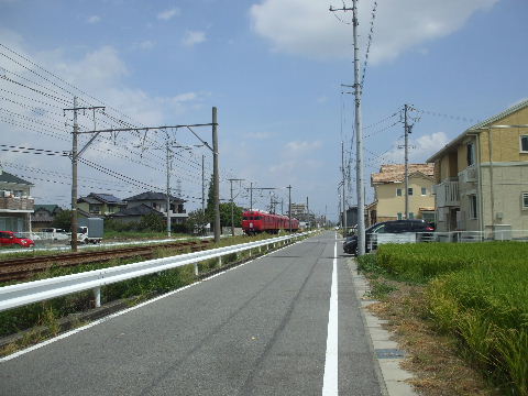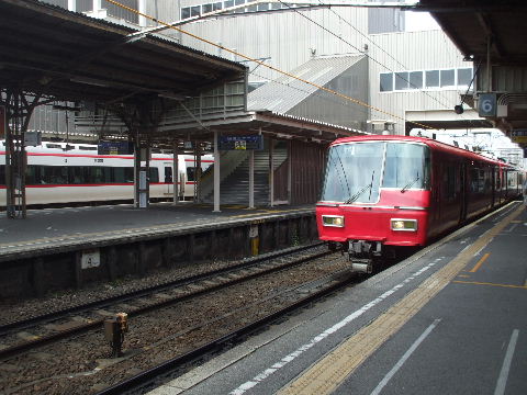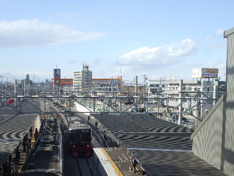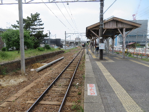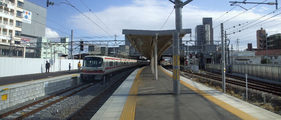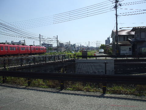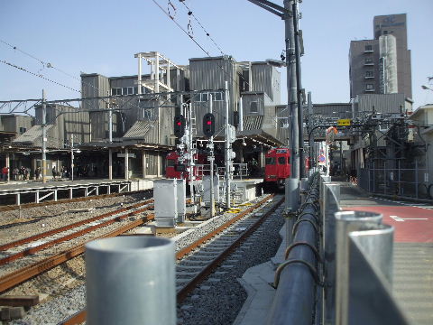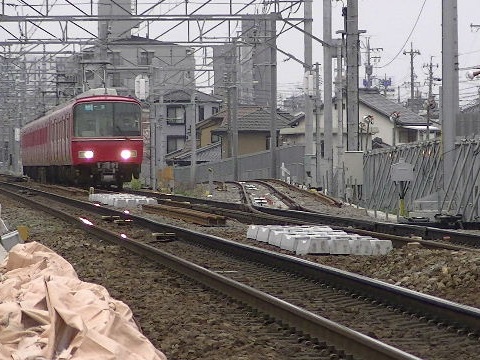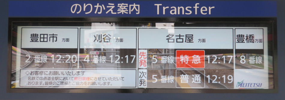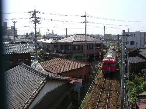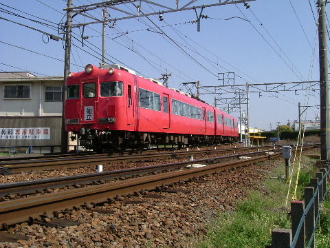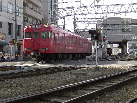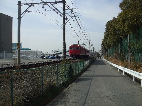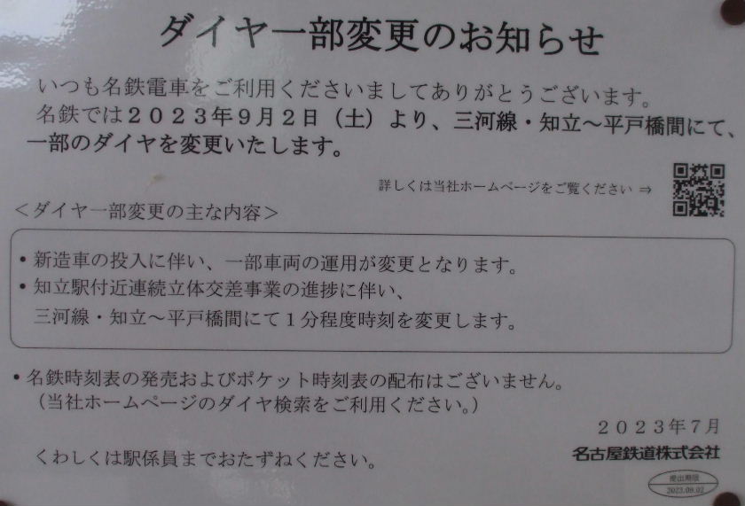 | 2024年03月16日。国道一号線から。猿投方面 接近中。知立方面停車中。旧駅では猿投行きが 先に到着していたが駅が三河八橋に近づいたので 新駅では知立行きが先に到着する。 |