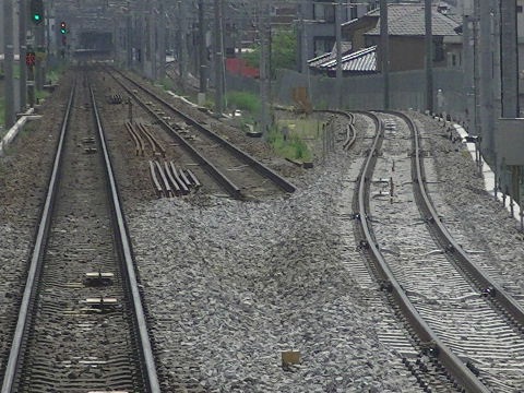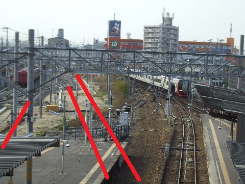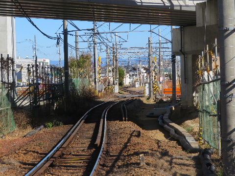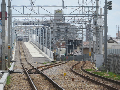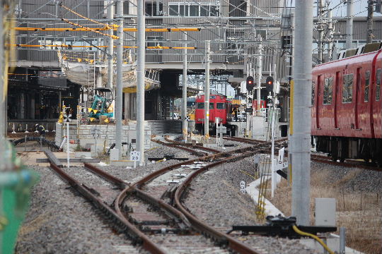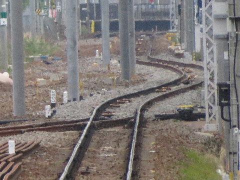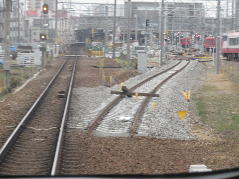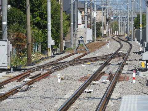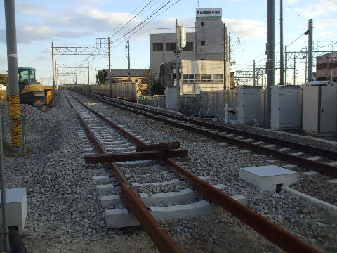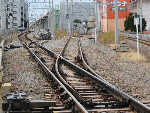 | 2020年01月19日。名古屋方、上り線と下り仮線をつなぐ長い渡り線 の分岐の先に上り仮線が出来た時につなぐ渡り線用の分岐器が設 置されている。 |