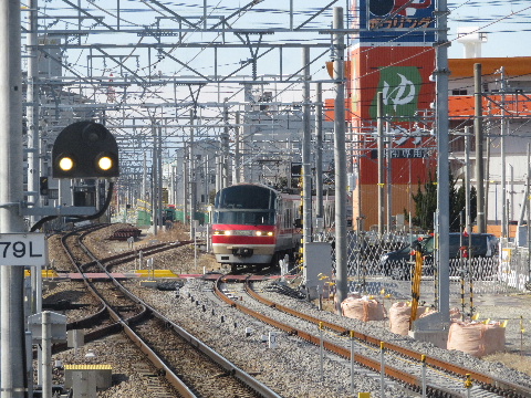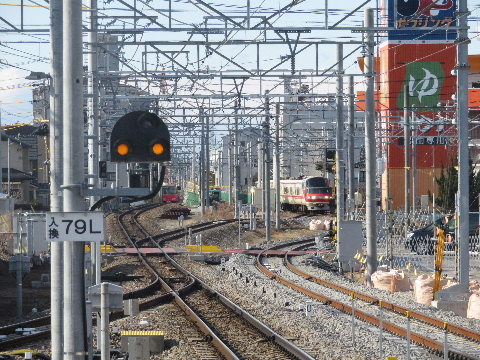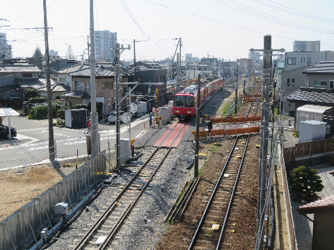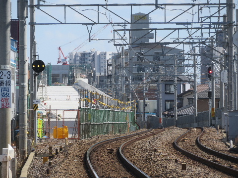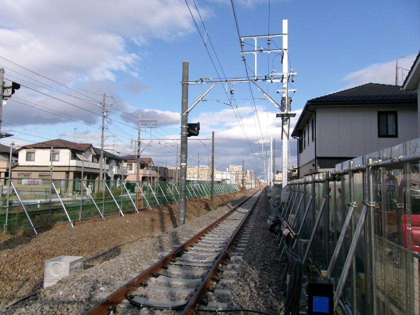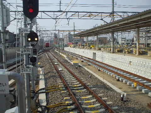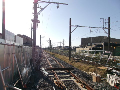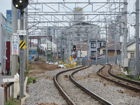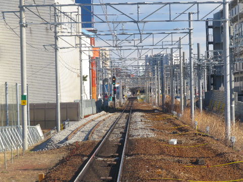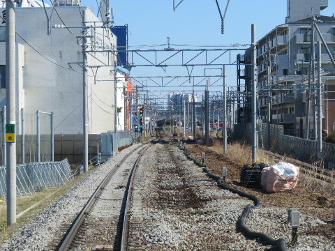 | 2015年02月01日。この辺は仮線が今の線より少し低くなっている。 | 2015年02月28日。仮線使用が始まり仮線合流地点に第3出発信 号機。 |