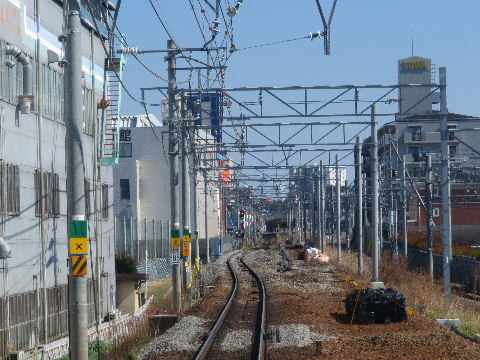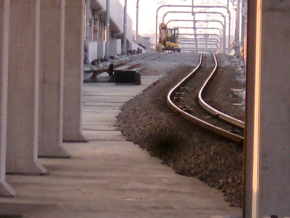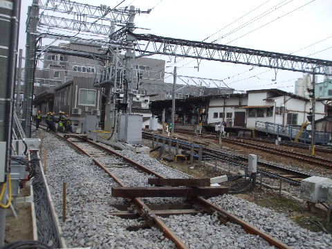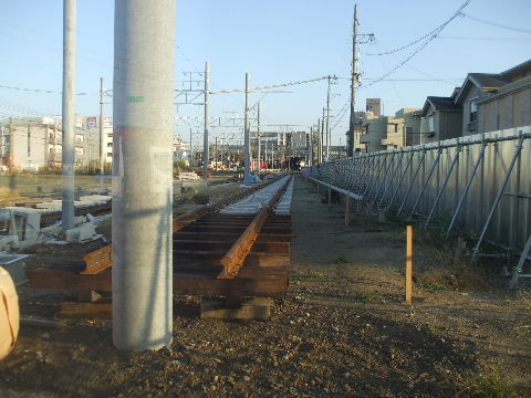 2017年01月13日。上り仮ホームに向かう線路でここでつなぎ変え。 まだ上り線の架線柱がレールのすぐ脇のバラストの中に立ってい る。 |