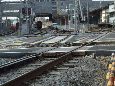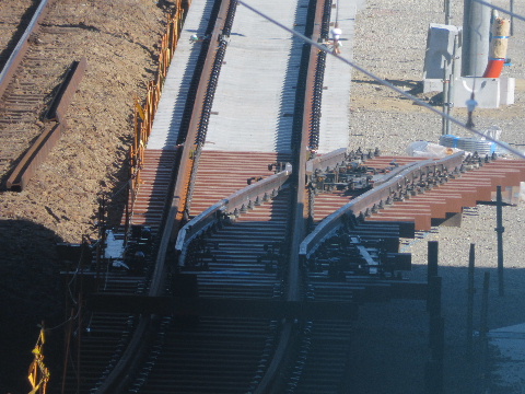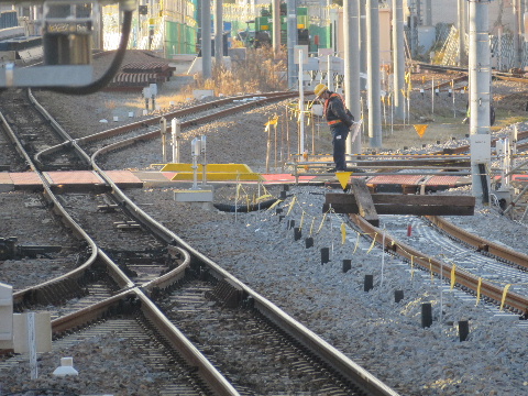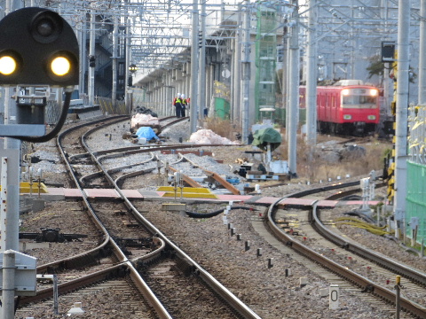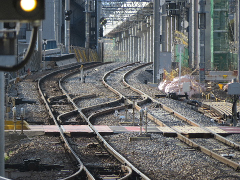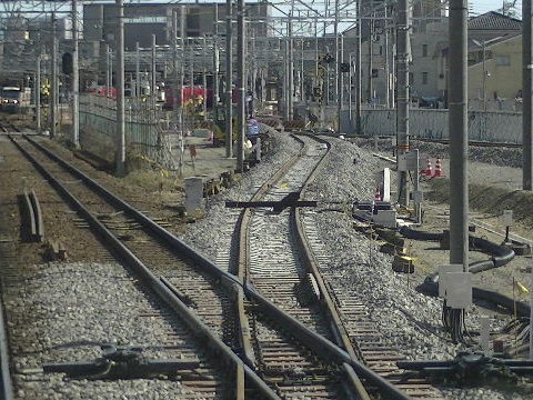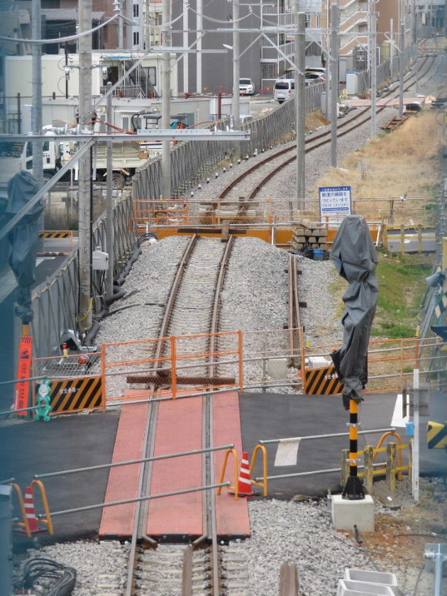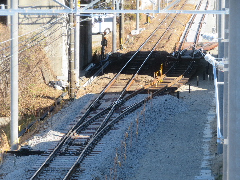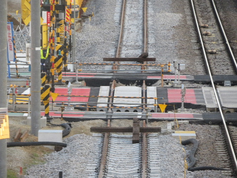 2020年02月23日。奥に新しく設置した分岐器が長い渡り線に接続 され手前の長い渡り線用の分岐器が新しい上下仮線の渡り線に変 わった。 |