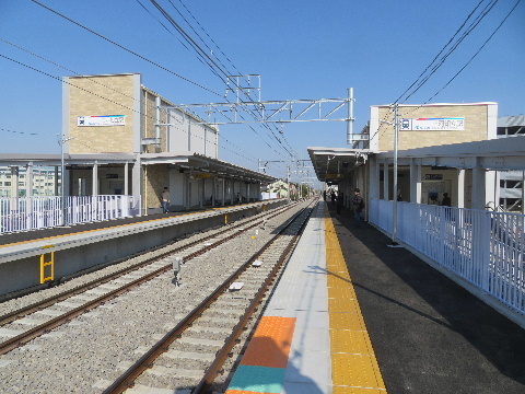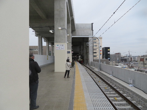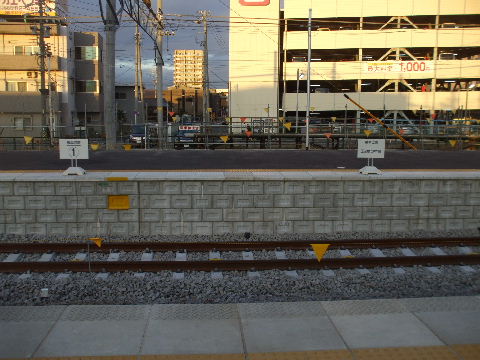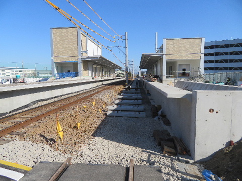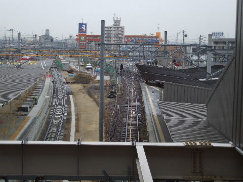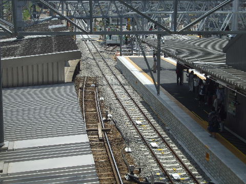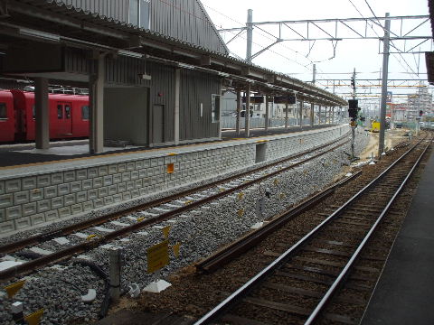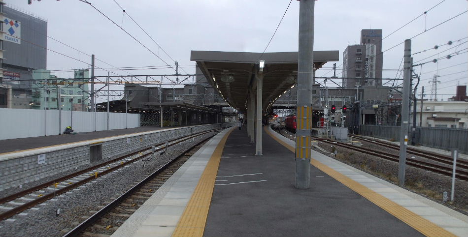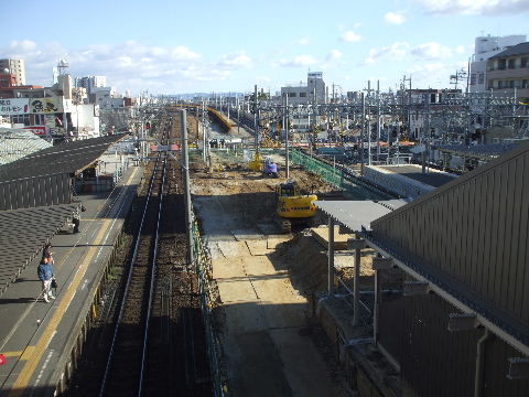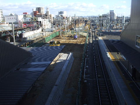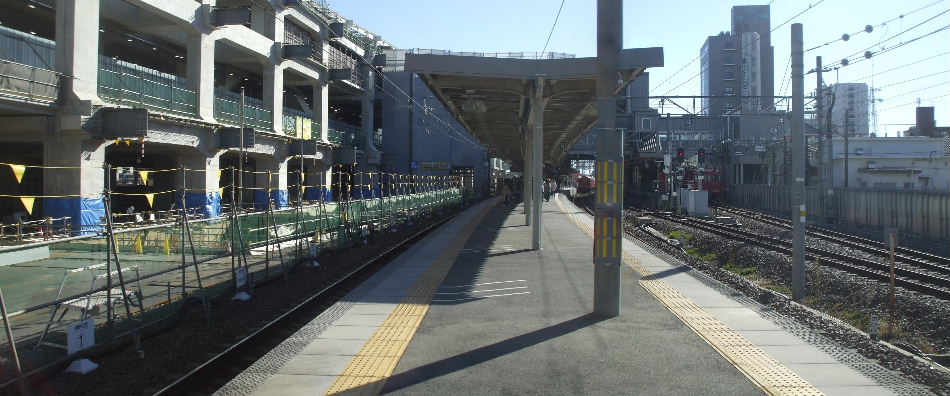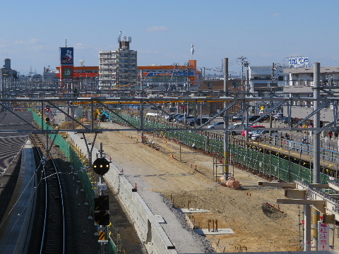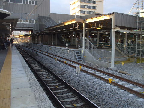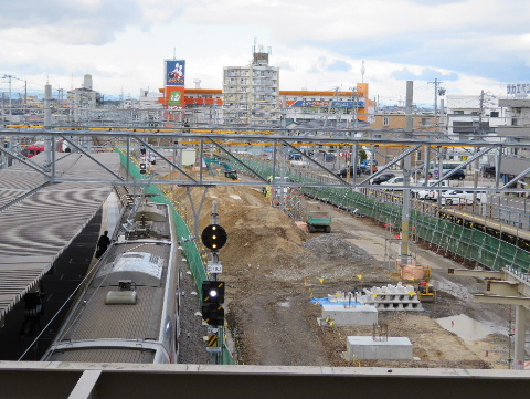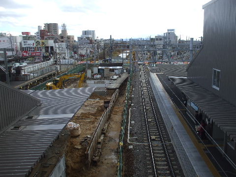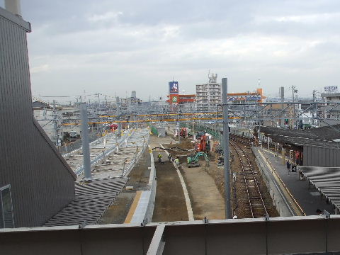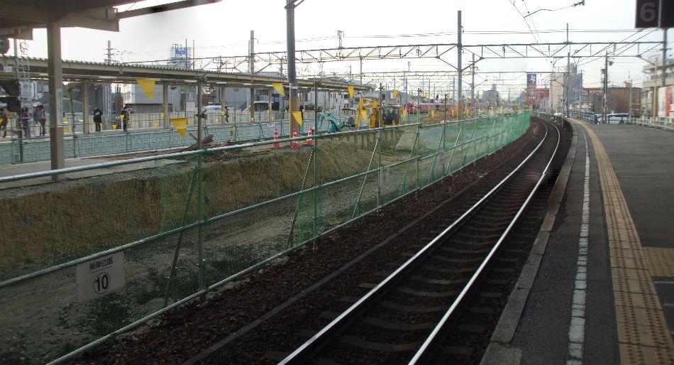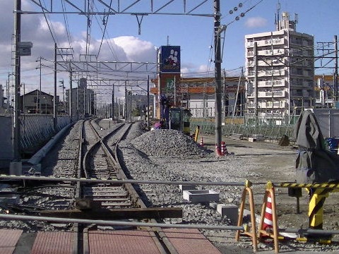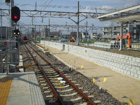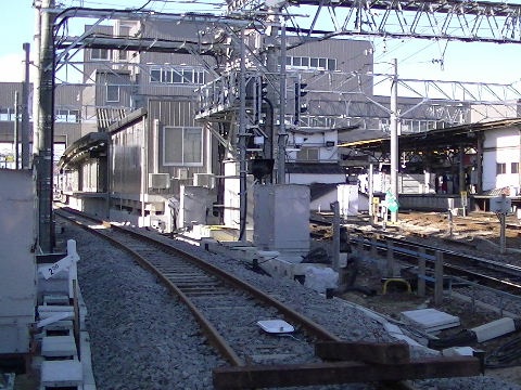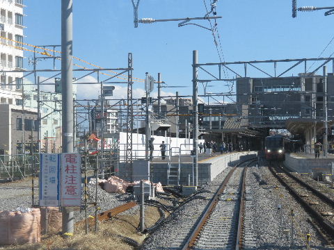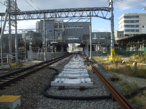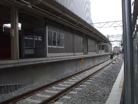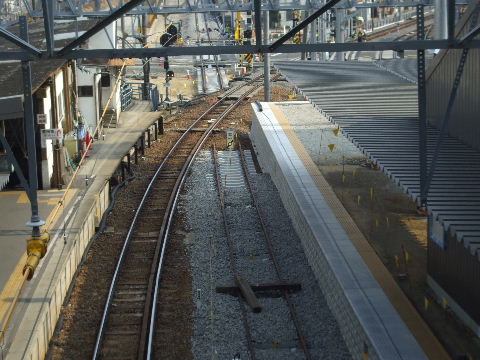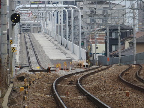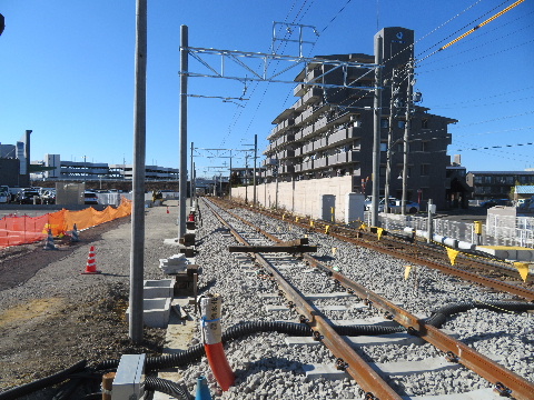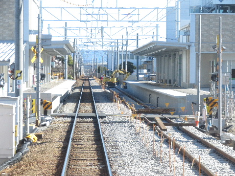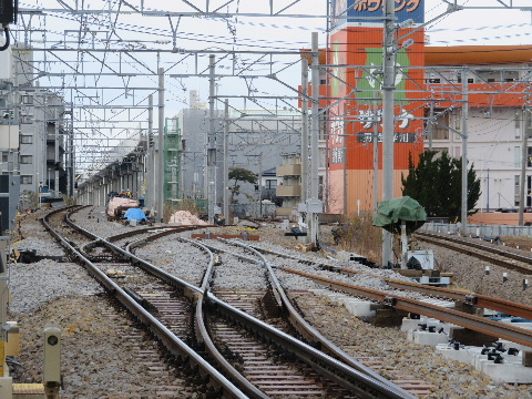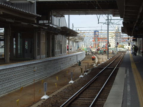 | 2018年01月13日。ホームから見る。奥の渡り線に並行してカーブし てくる敷設中の上り仮線。 |