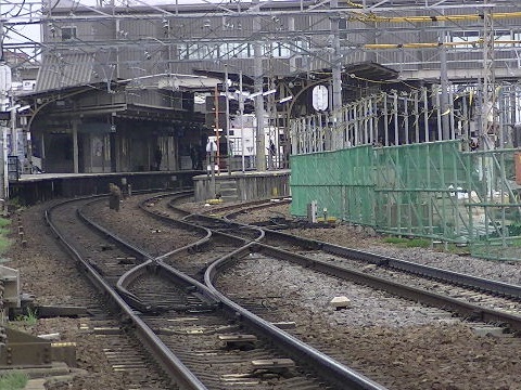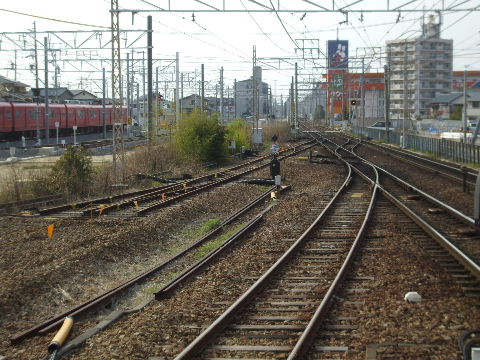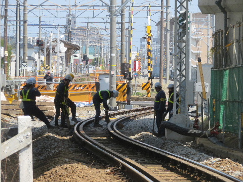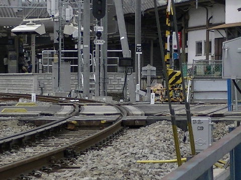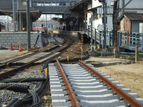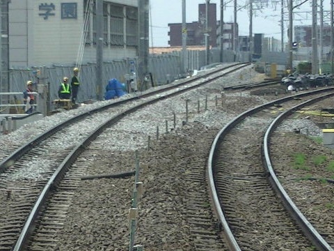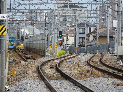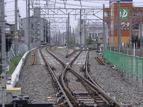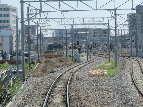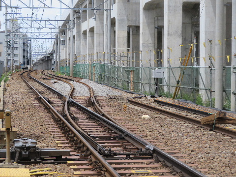 2016年04月10日。下り線の仮線への切り替えが間近で準備が進 んでいる。右から合流している仮線を使い始めれば現下り線とこの 分岐器は撤去される。 |