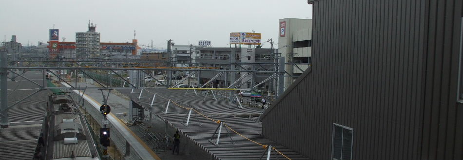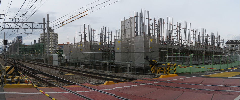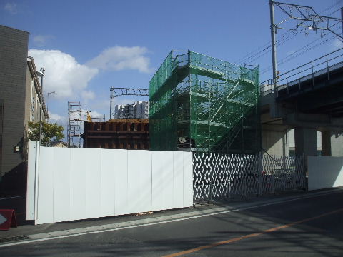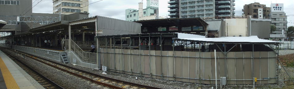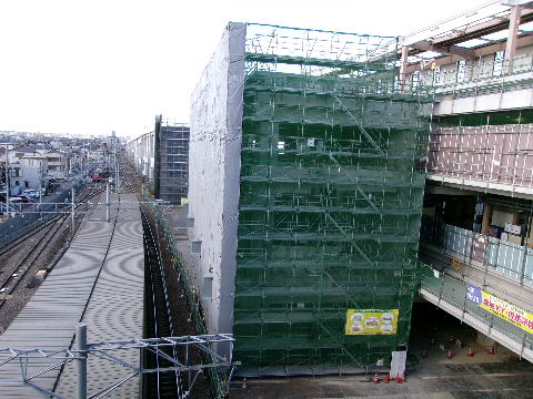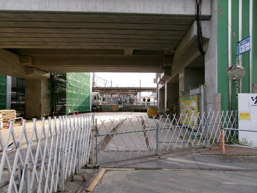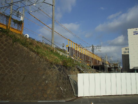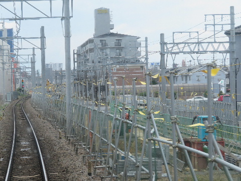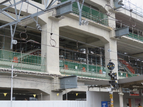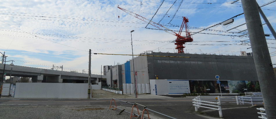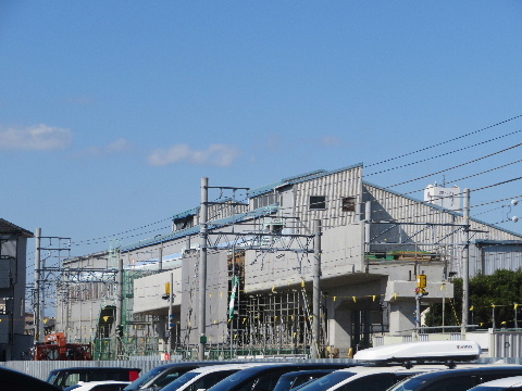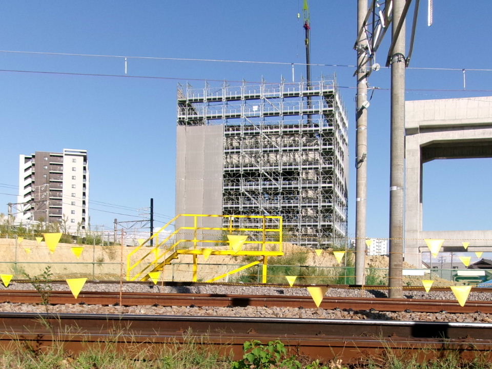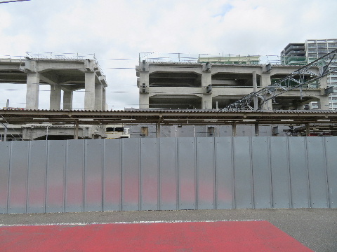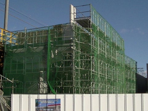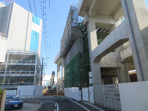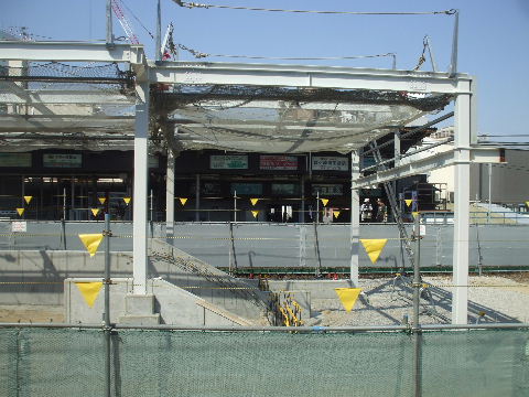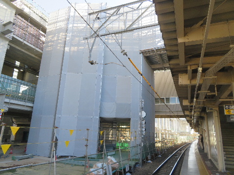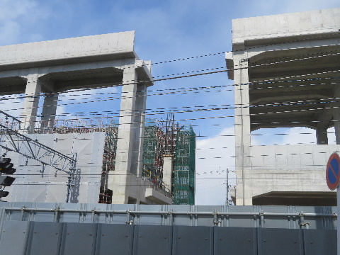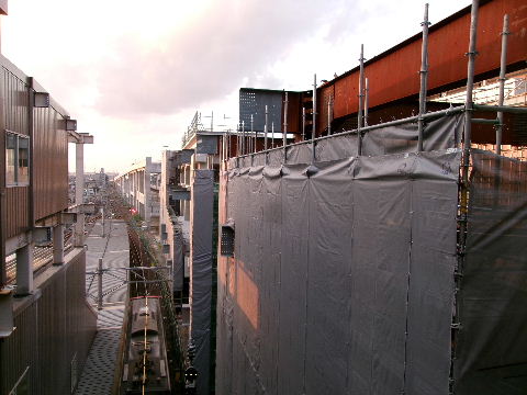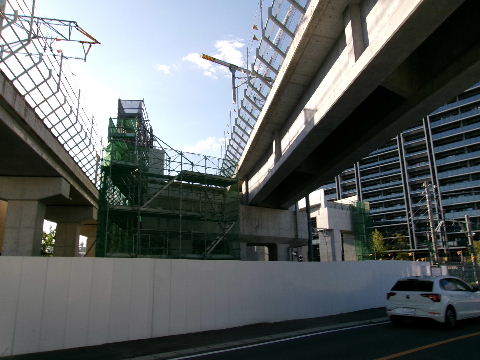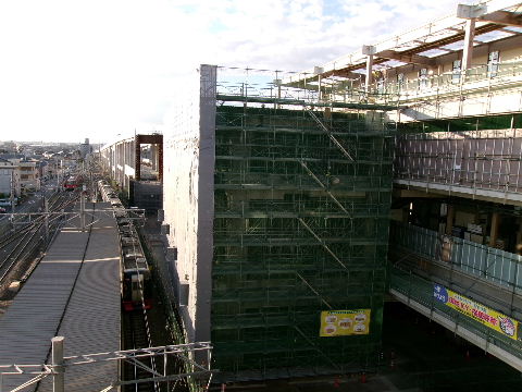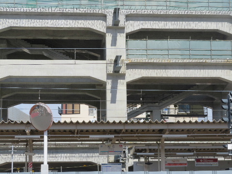 | 2017年09月29日。駅前から見る。 | 2017年11月04日。落下物防止用の柵が二段になっている。 |