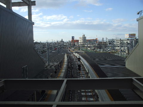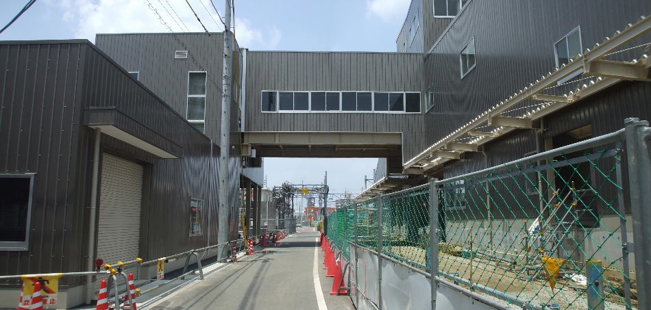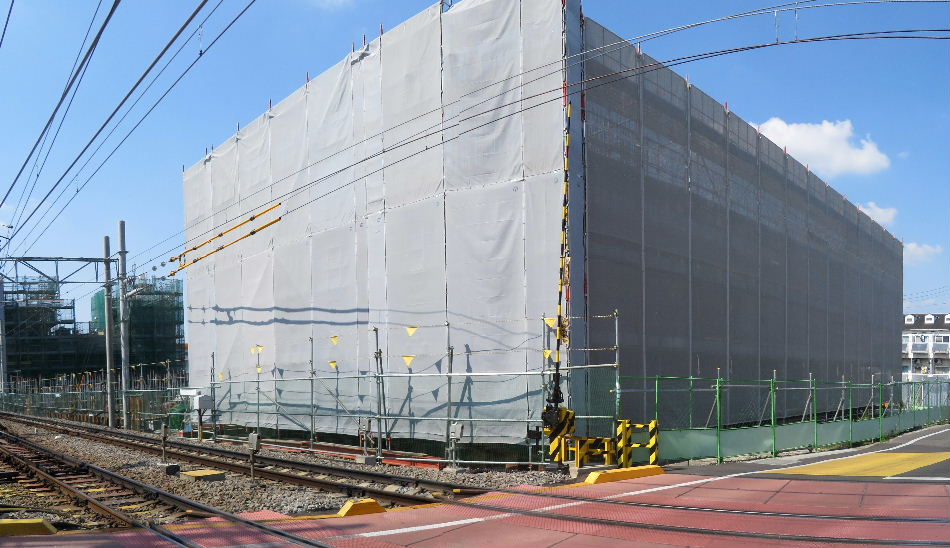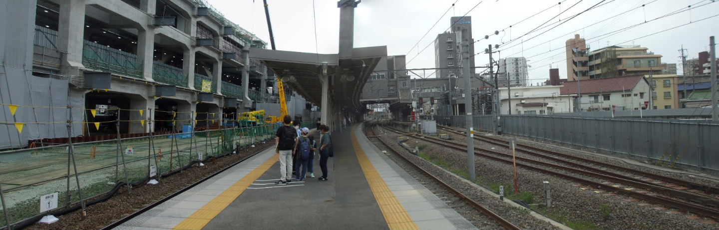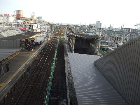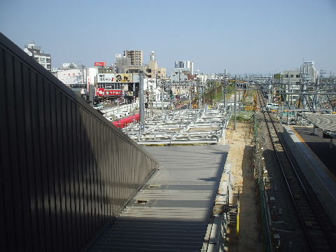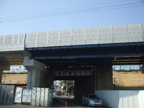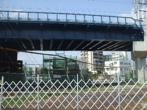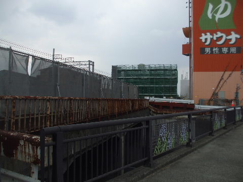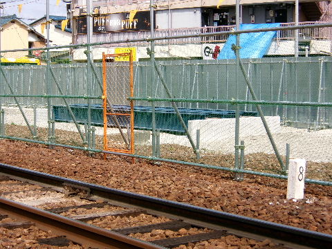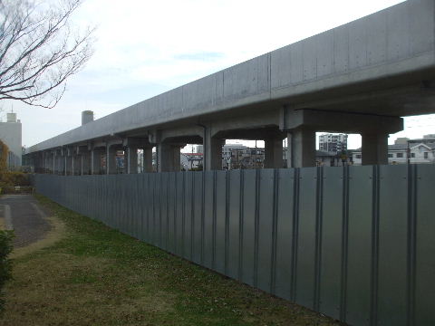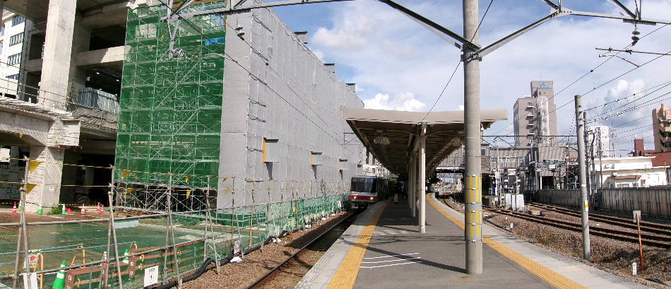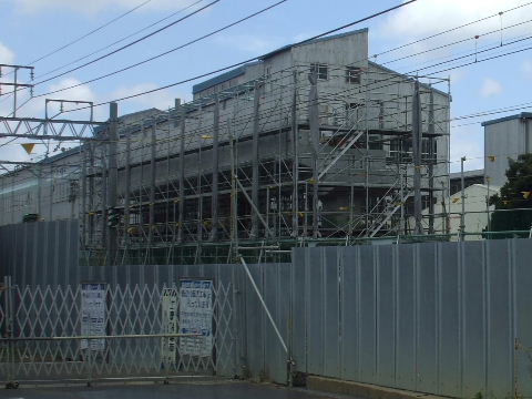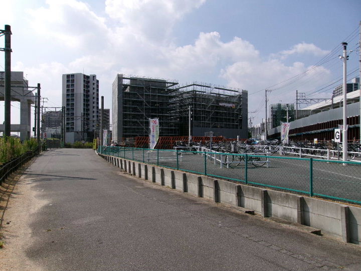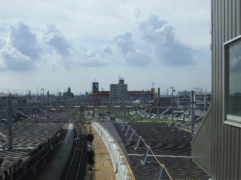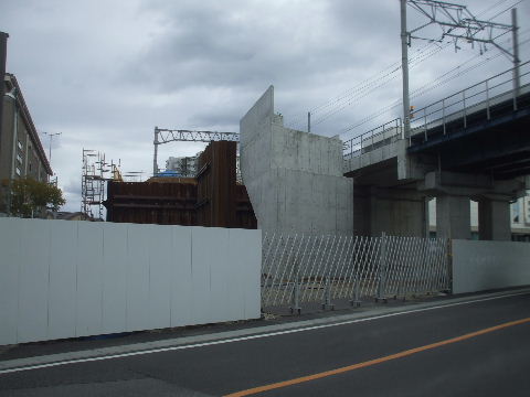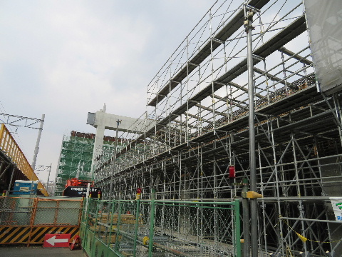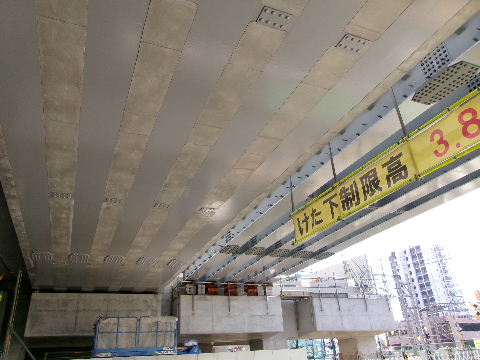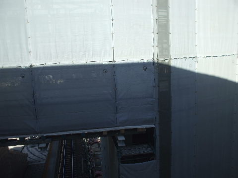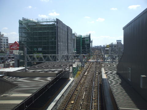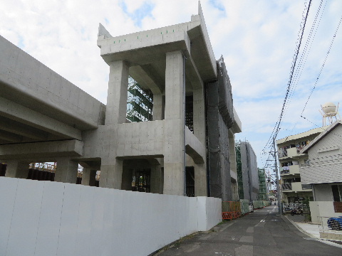 | 2017年09月29日。駅前から見る。 | 2017年11月04日。落下物防止用の柵が二段になっている。 |