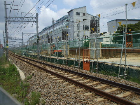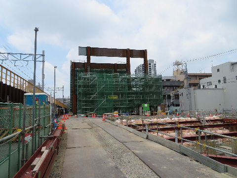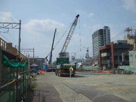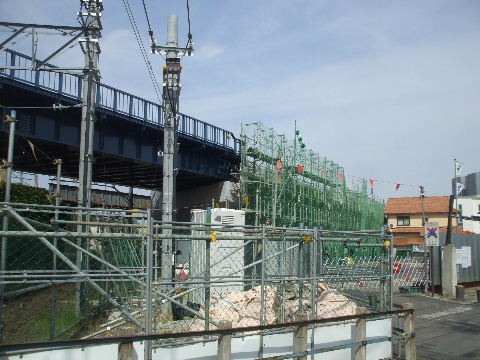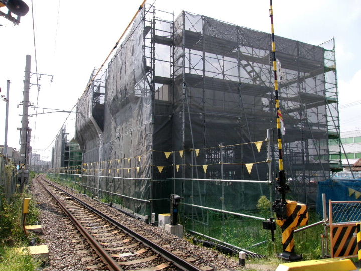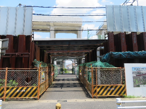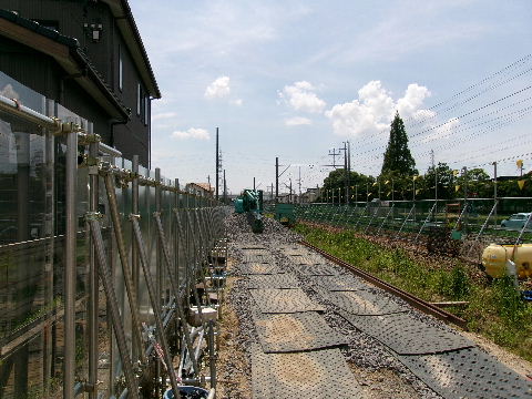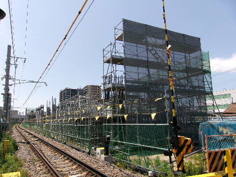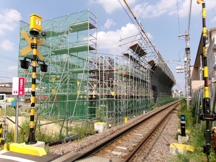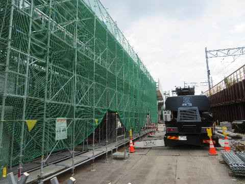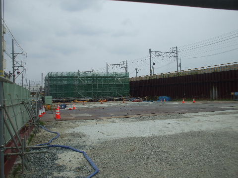 | 2018年07月29日。手前に下り仮線。その向こうに高架橋工事の足 場。この足場のあるところに上り仮線が通るような気がする。 |