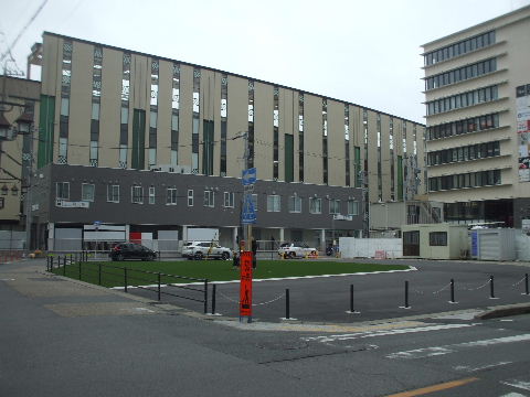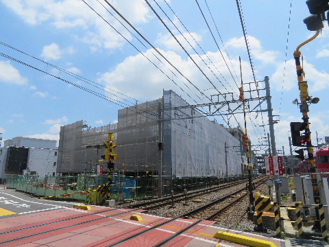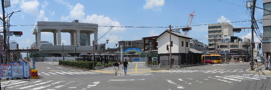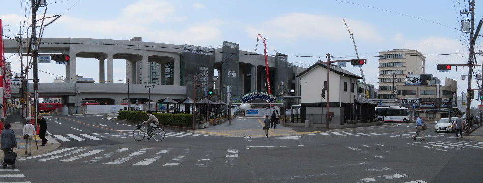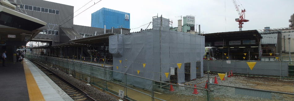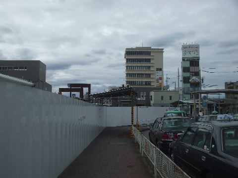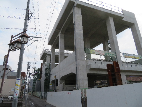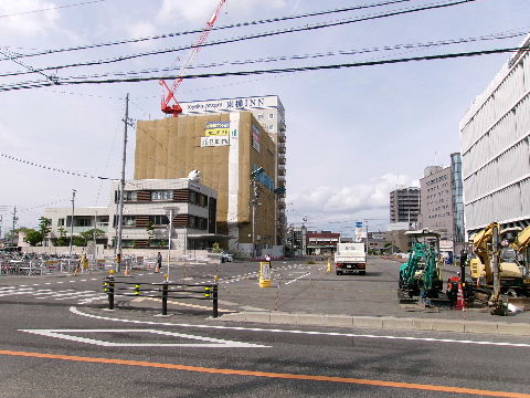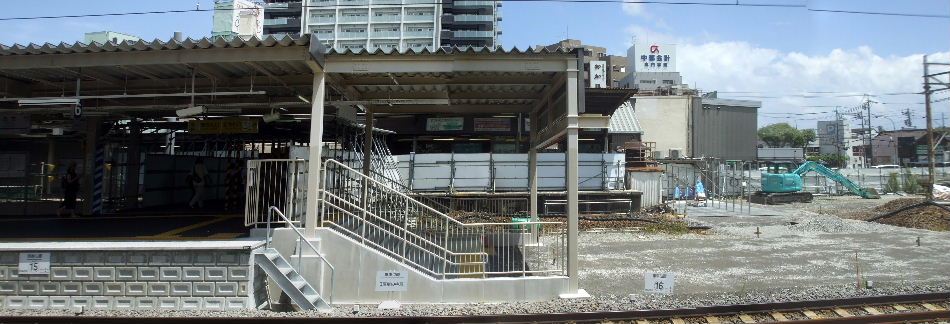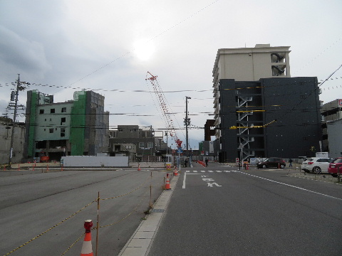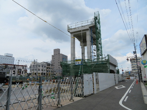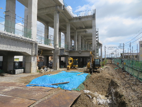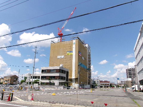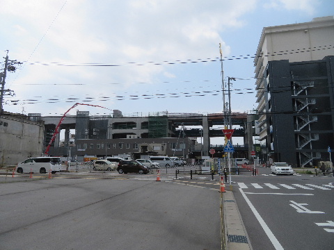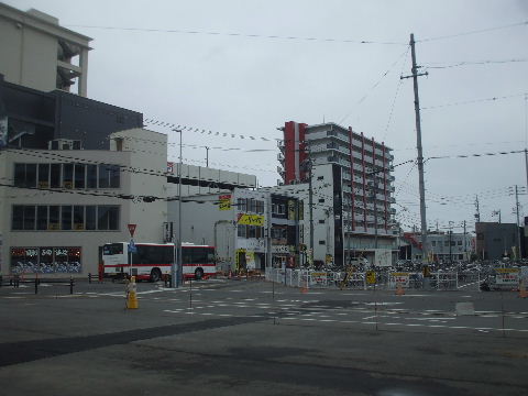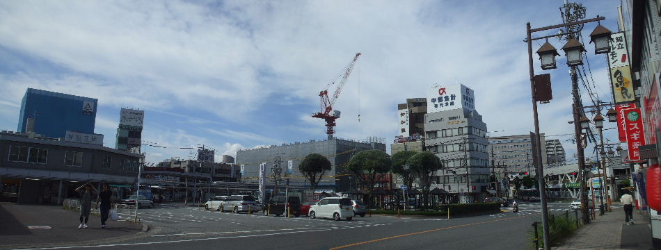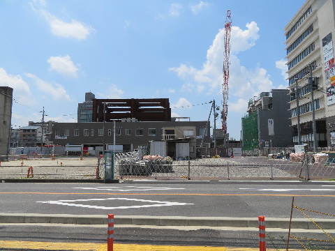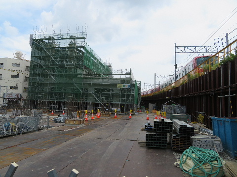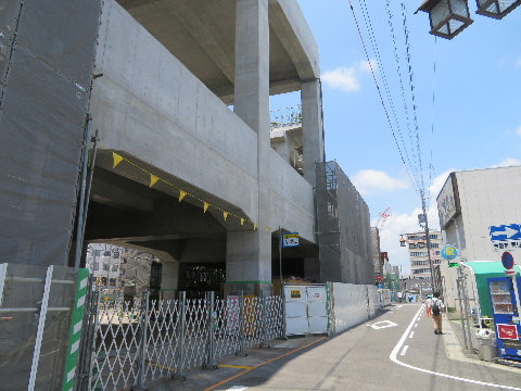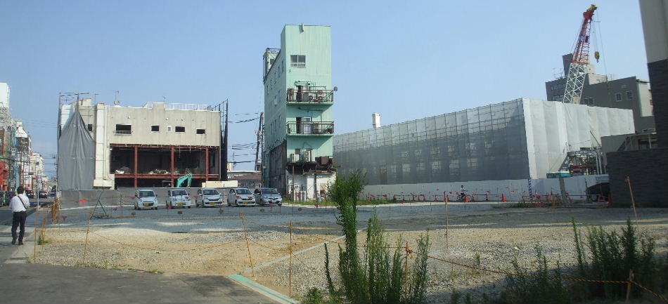 | 2017年08月26日。駅横にも新しいビルがほぼできている。この手 前に高架橋をくぐる新しい道路が出来れば駅前広場の向かい側に なる。 |
