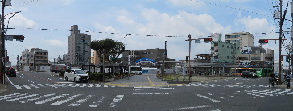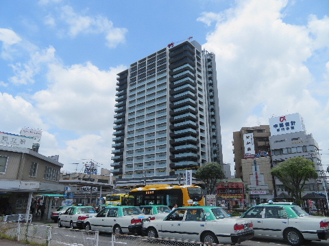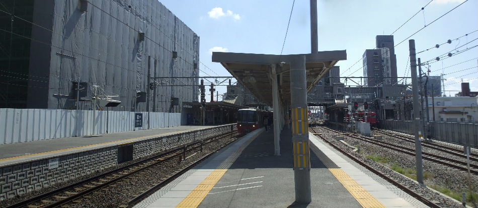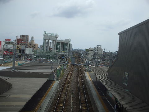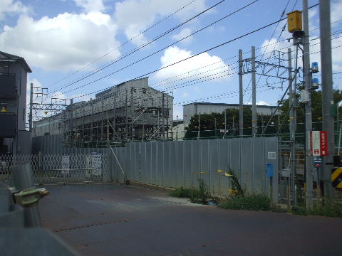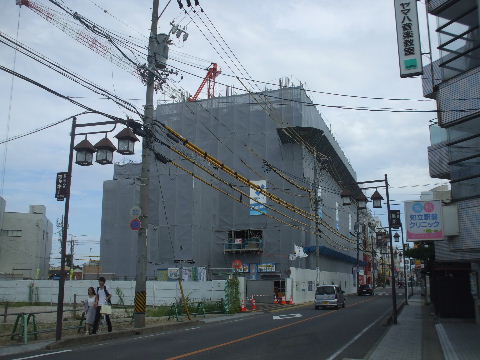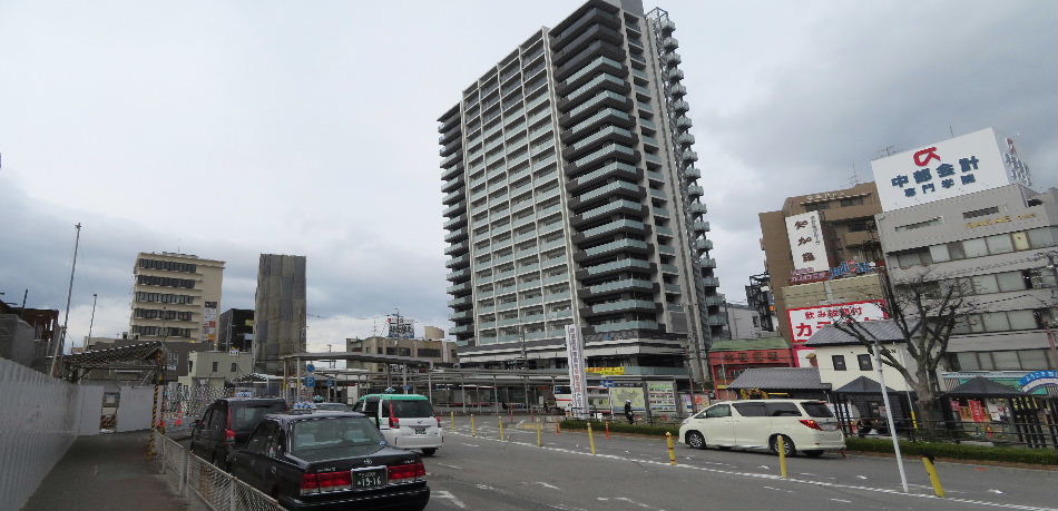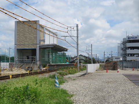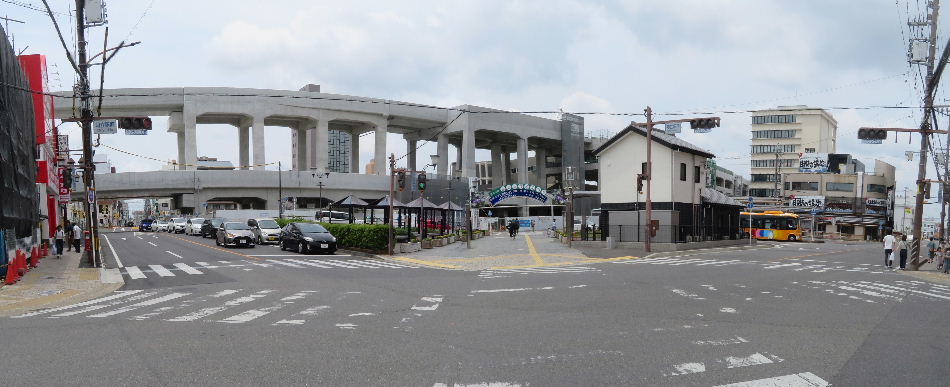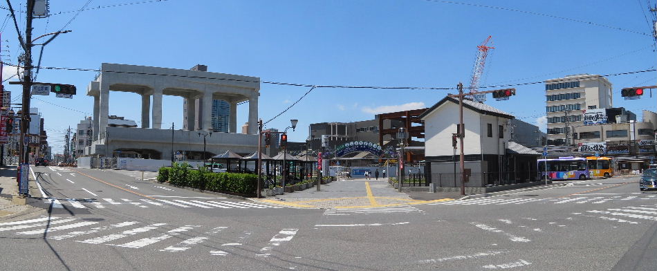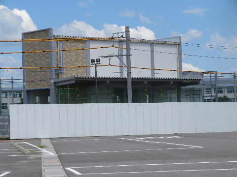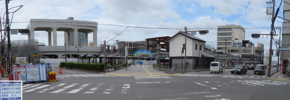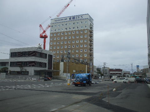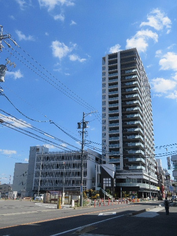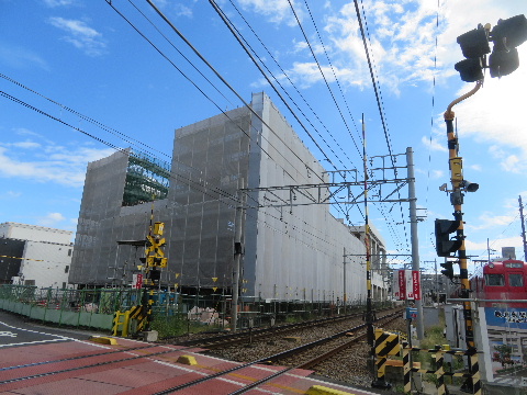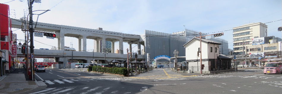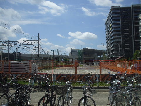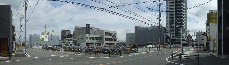 | 2017年08月26日。駅横にも新しいビルがほぼできている。この手 前に高架橋をくぐる新しい道路が出来れば駅前広場の向かい側に なる。 |