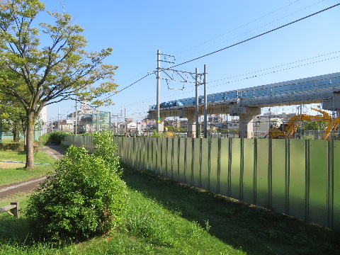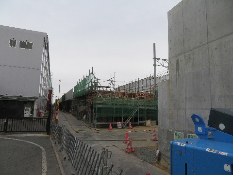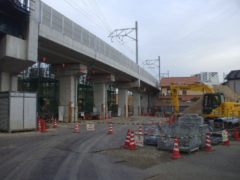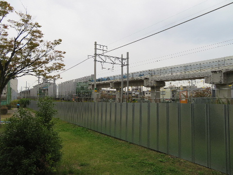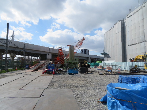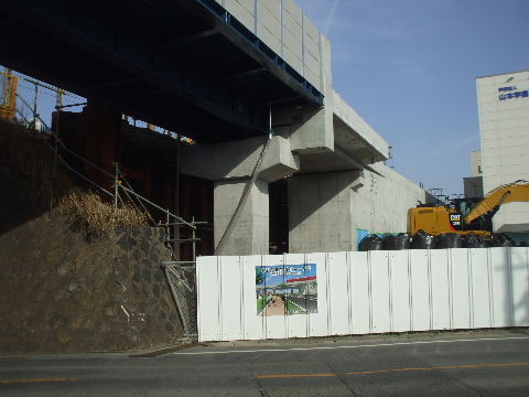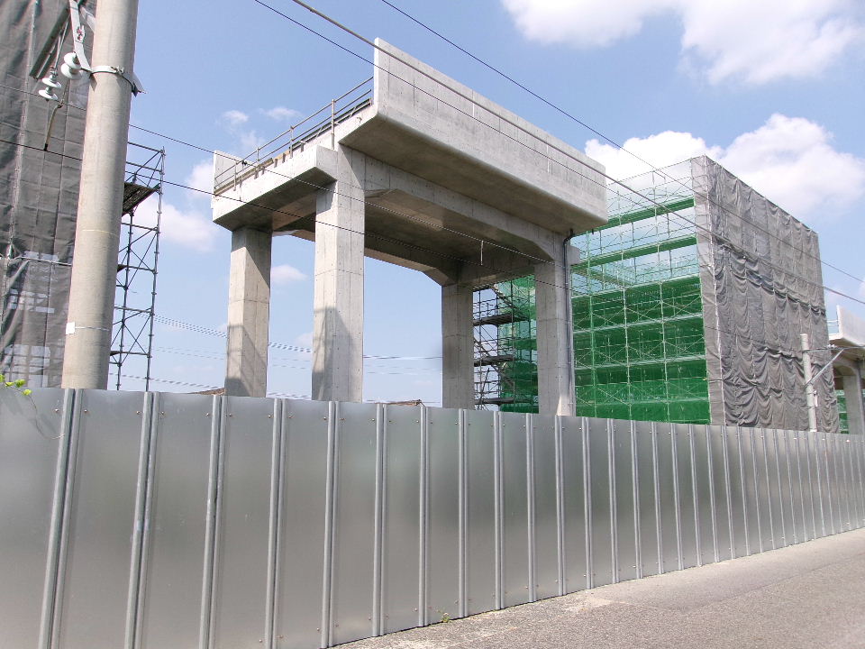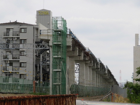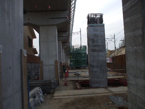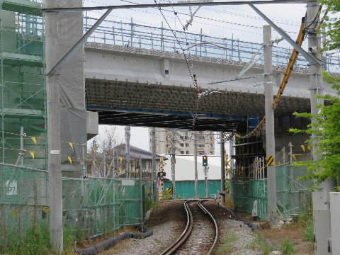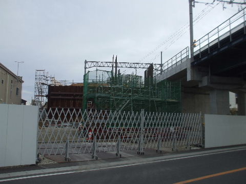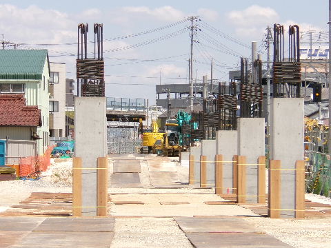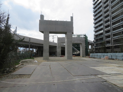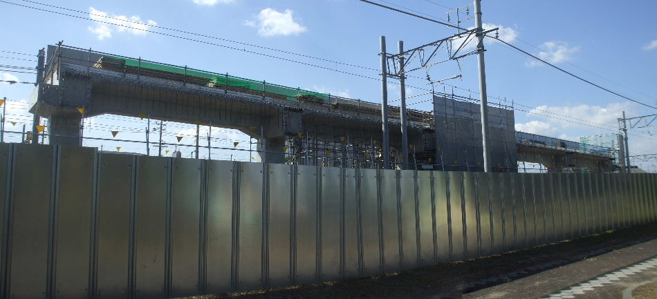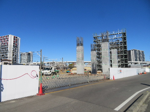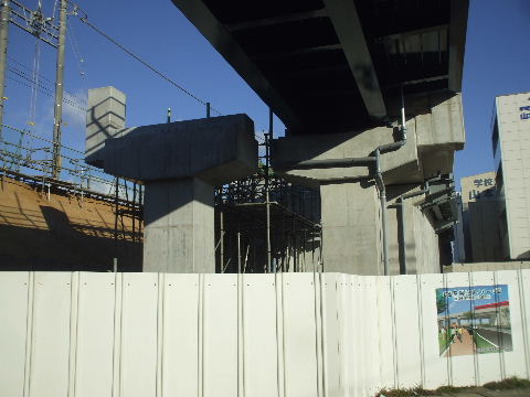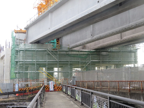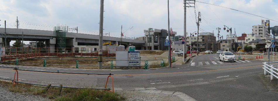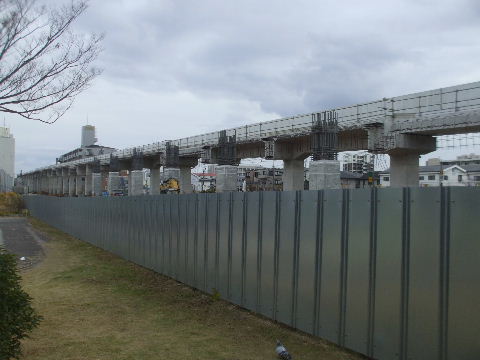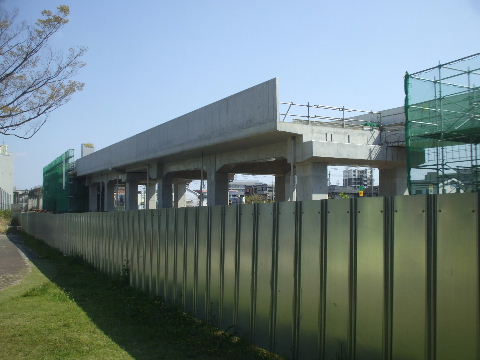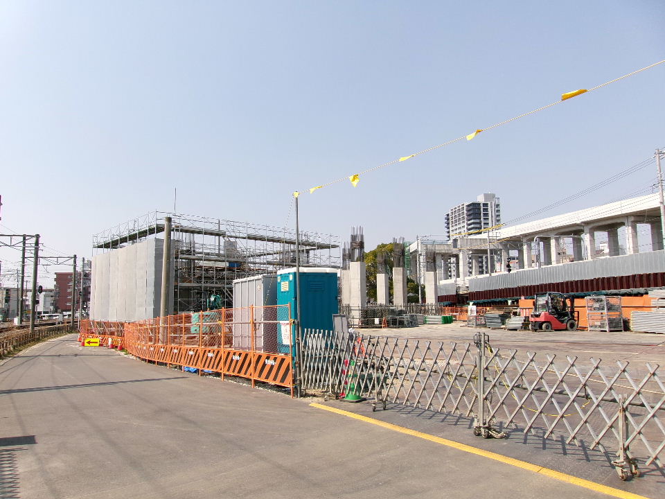 | 2021年04月11日。155号線から。手前、駅に向かって橋脚 工事が延びてくる。 |