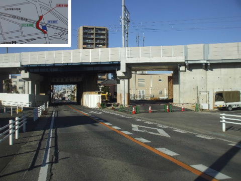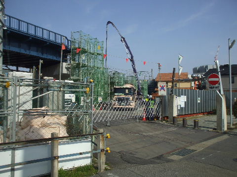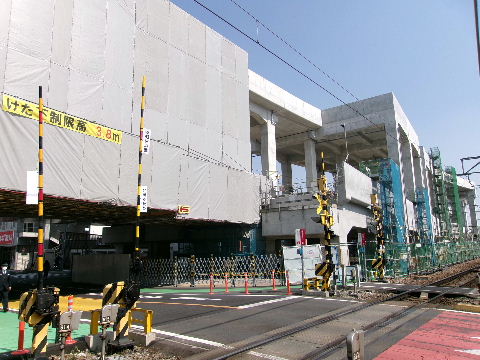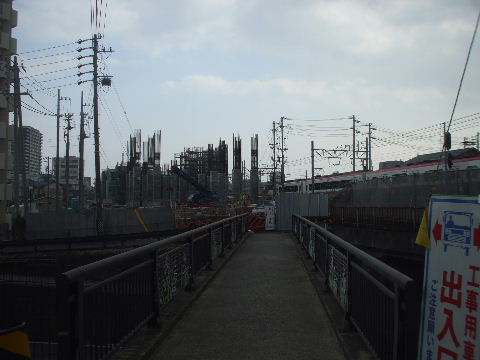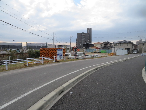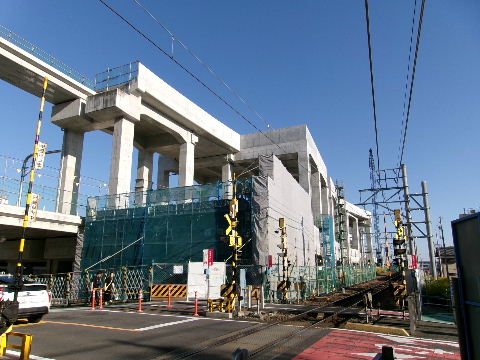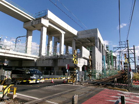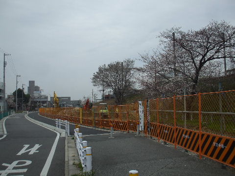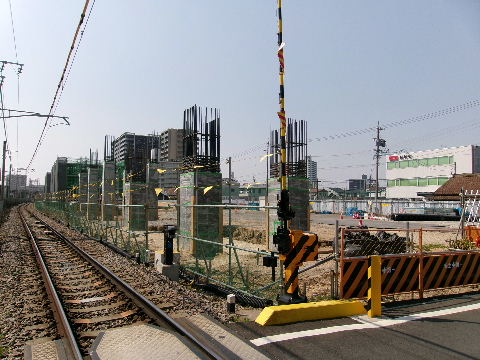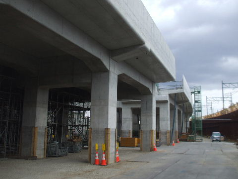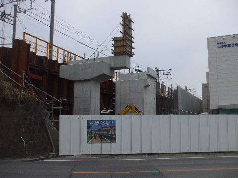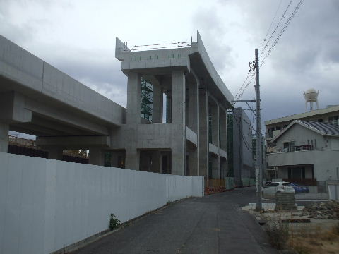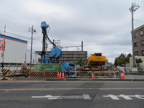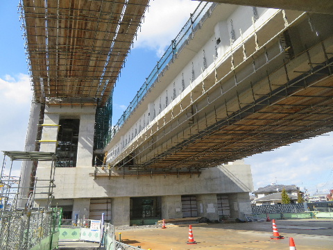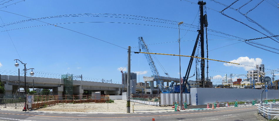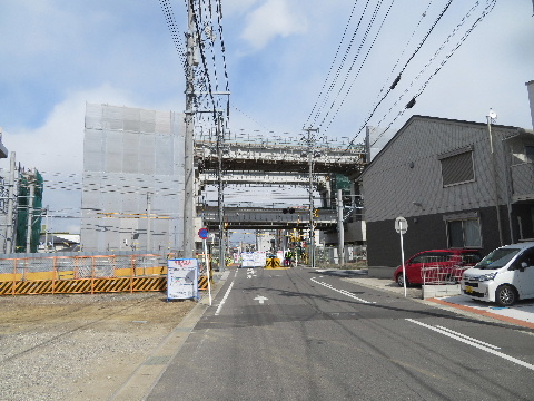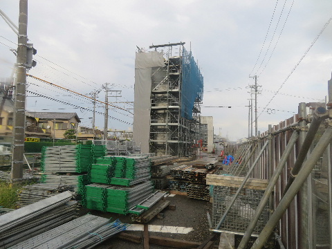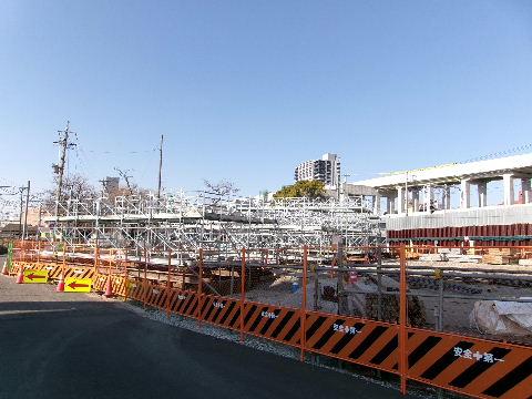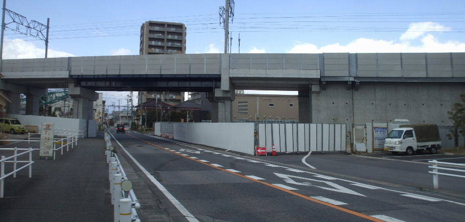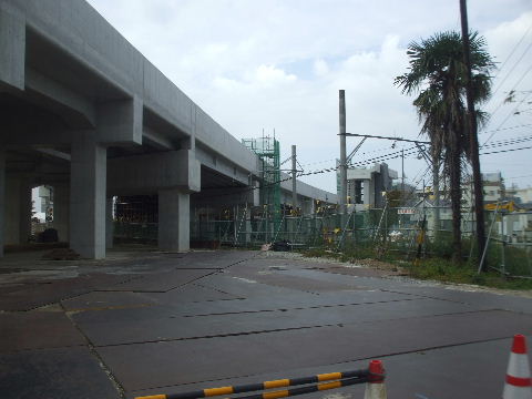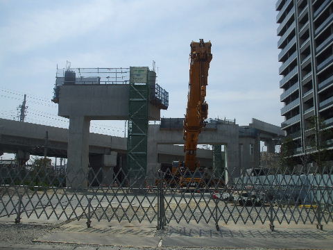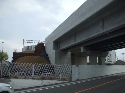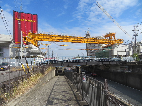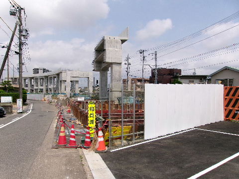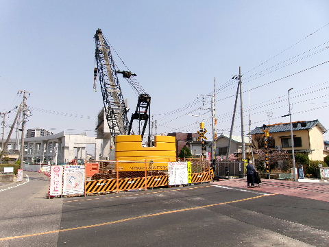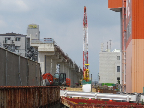 | 2021年04月11日。155号線から。手前、駅に向かって橋脚 工事が延びてくる。 |