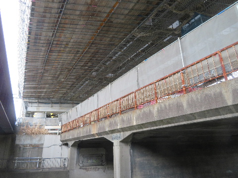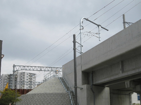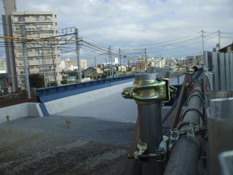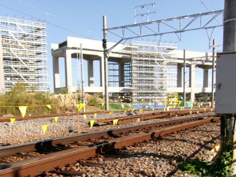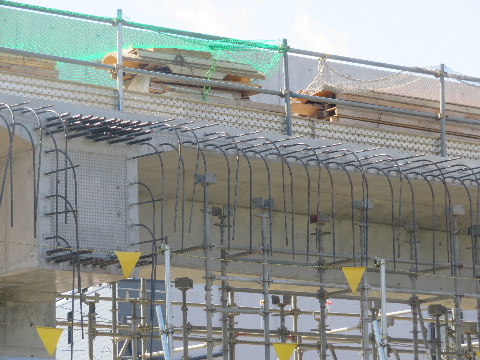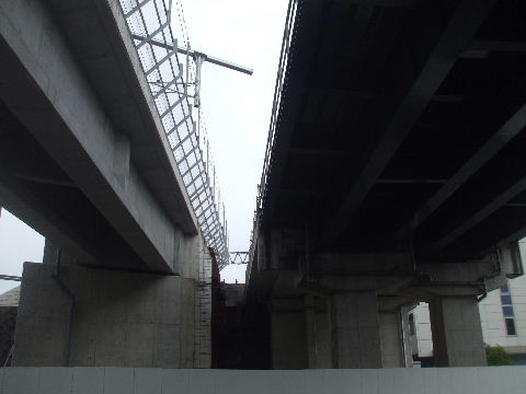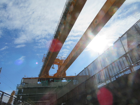| 2018年10月28日。1線分の幅もない高架橋でまだ継ぎ足すので鉄 筋が飛び出ていて目に刺さらないように折り曲げてある。 |