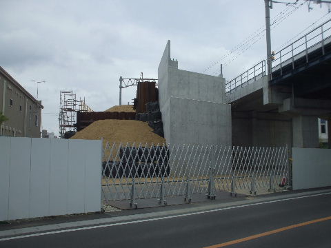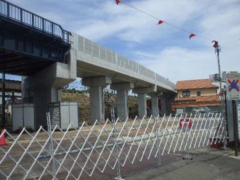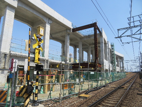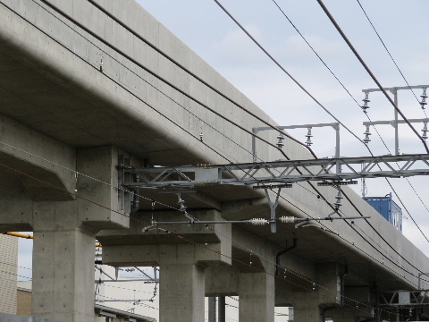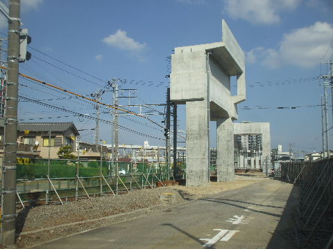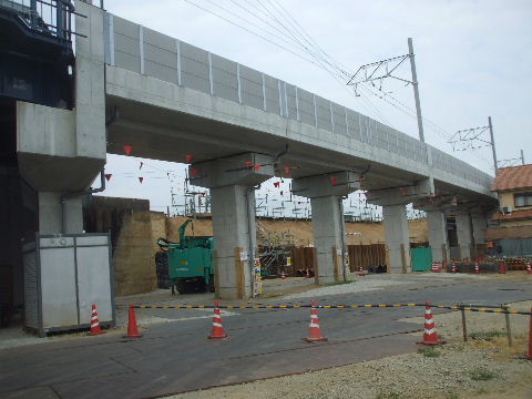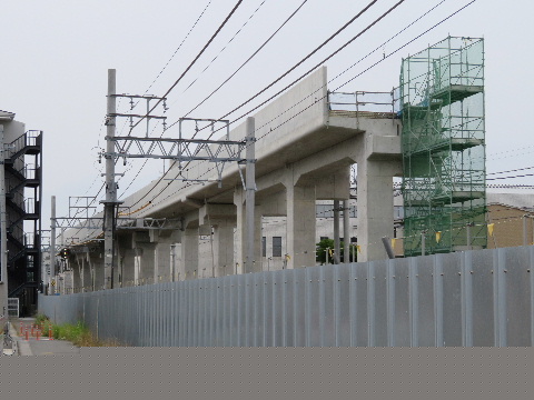 | 2020年05月03日。壁のようにたつ0.5線分の高架橋。あと1.5線分の 本線高架橋とその両側に3階の三河線につながる高架橋が作られ る。 |
