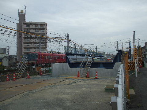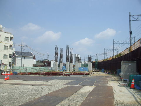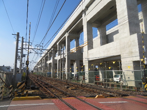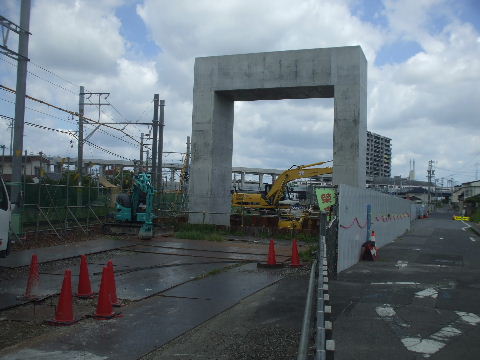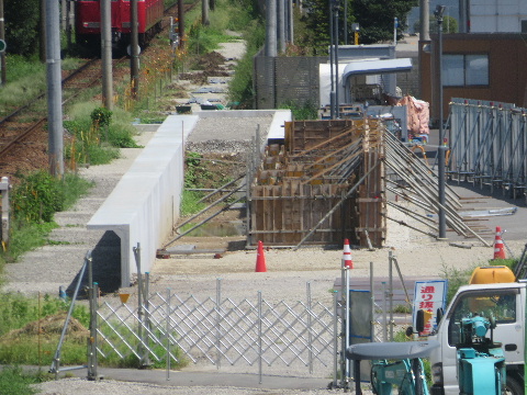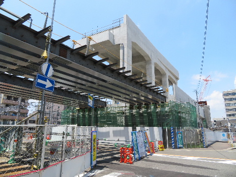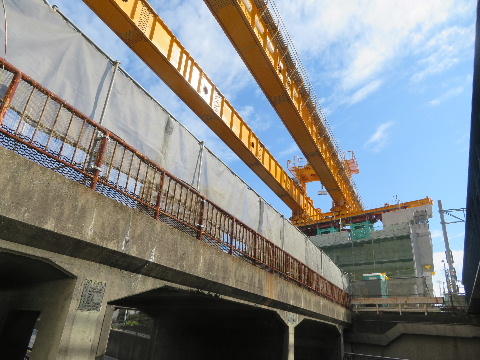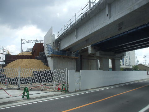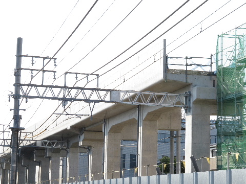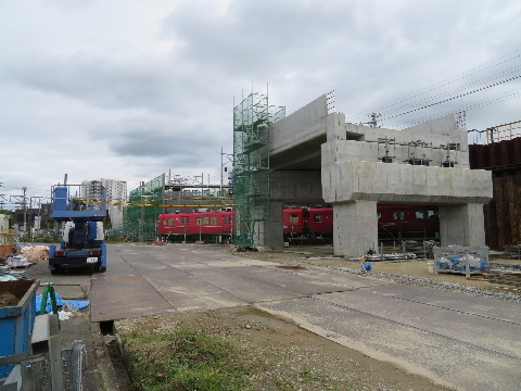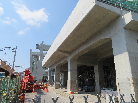 | 2018年09月11日。草刈公園前の幅の狭い高架橋もできてきた。 | 2018年09月11日。さらに駅方向へ橋脚工事。 |