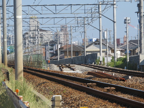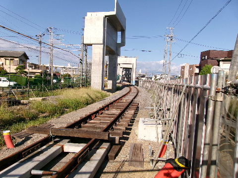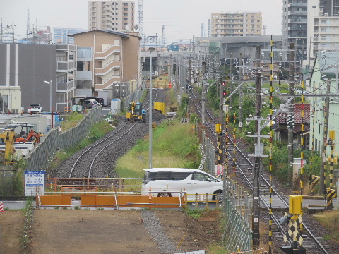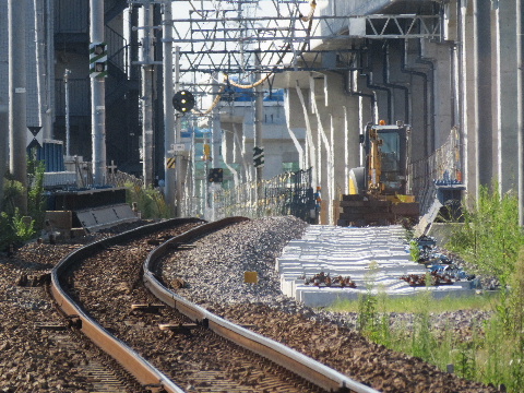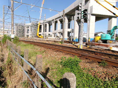 | 2019年08月03日。駅寄りには枕木が搬入されている。 | 2019年09月15日。高架が終わる地点。上り仮線のレールが敷設さ れ始めている。 |