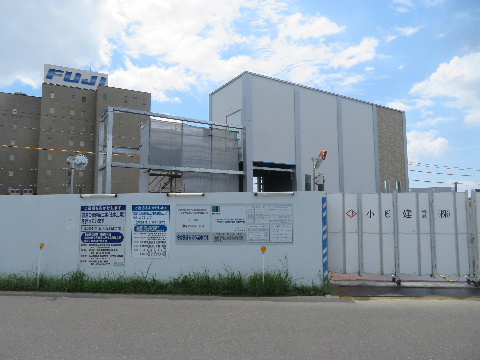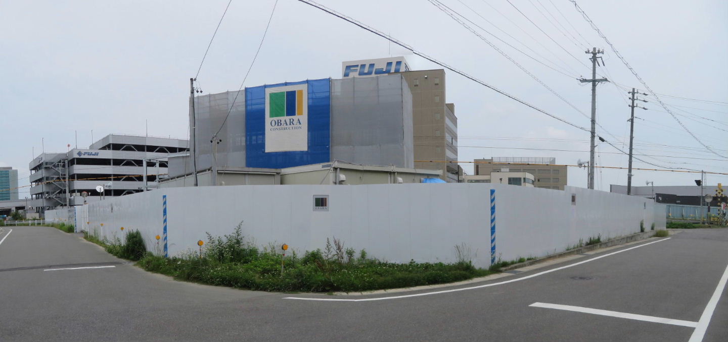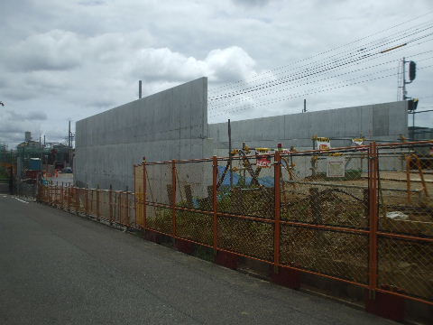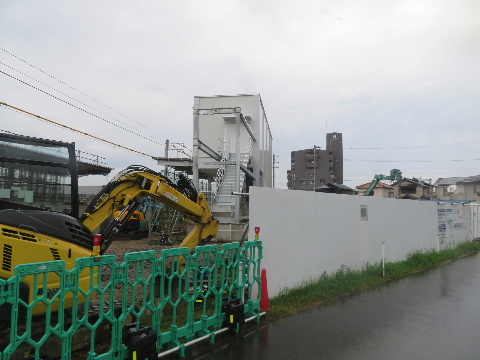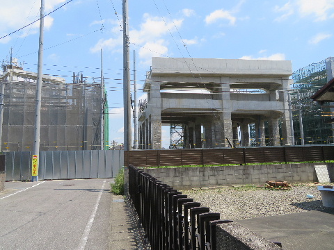 | 2020年08月02日。切り替わり部にプレハブ小屋が立ち、その向こ うで基礎工事始まる。 |