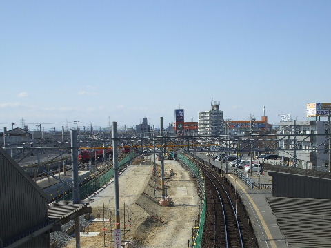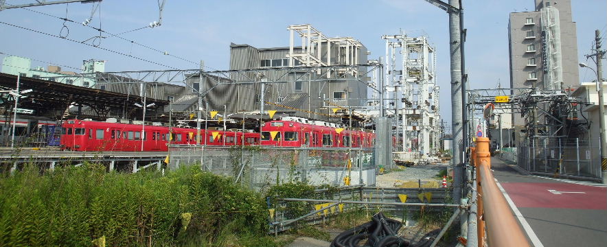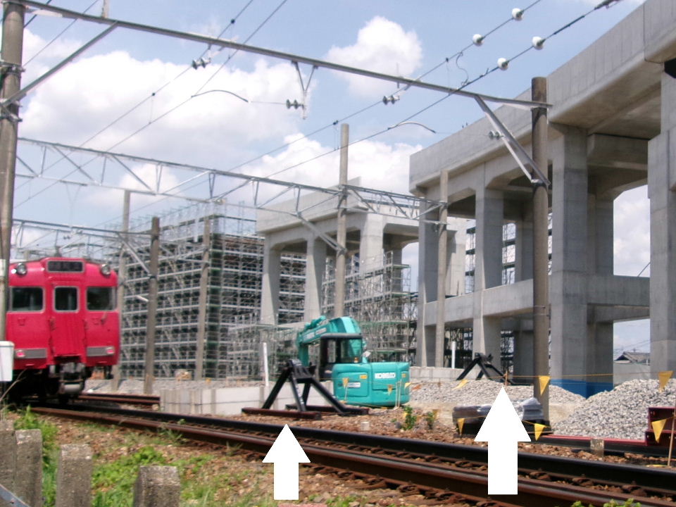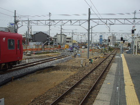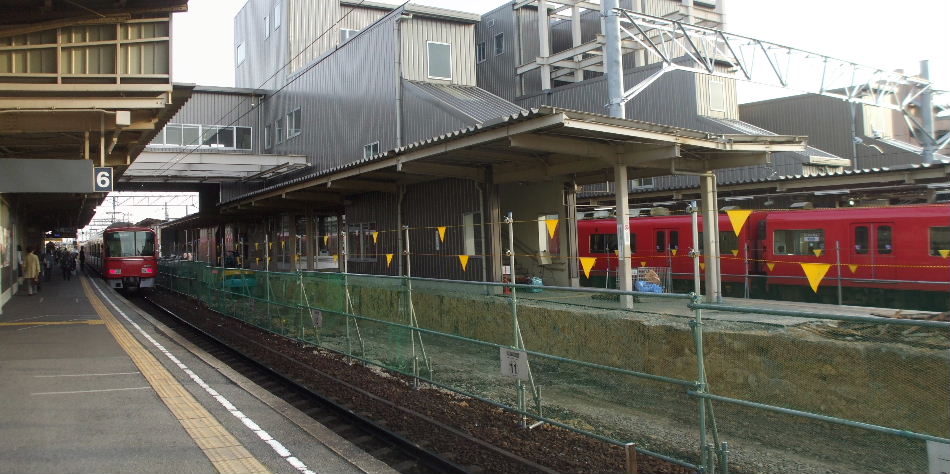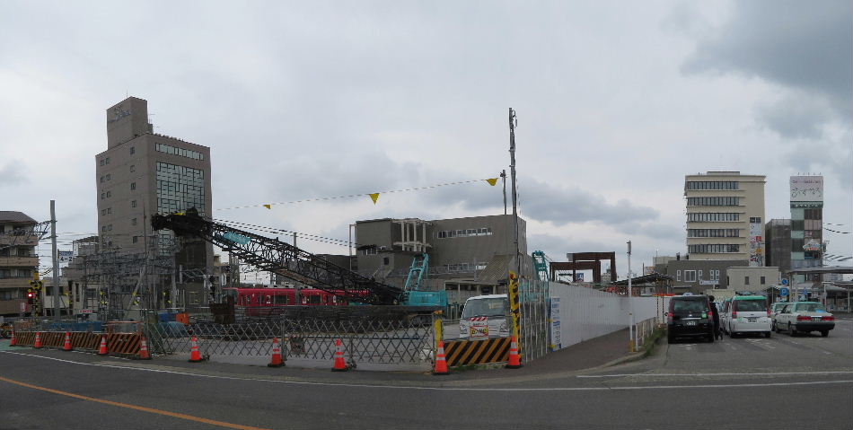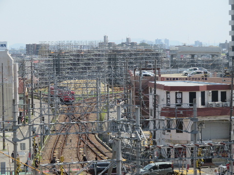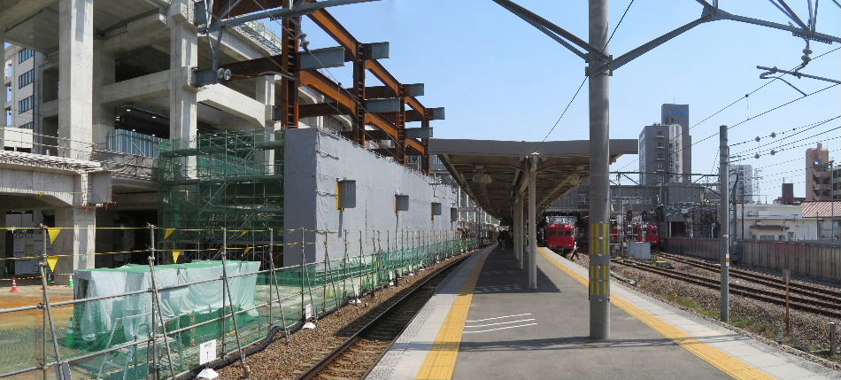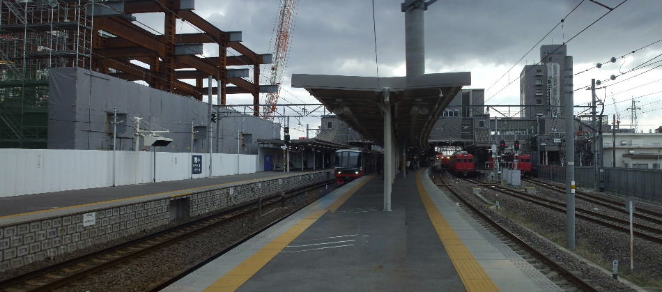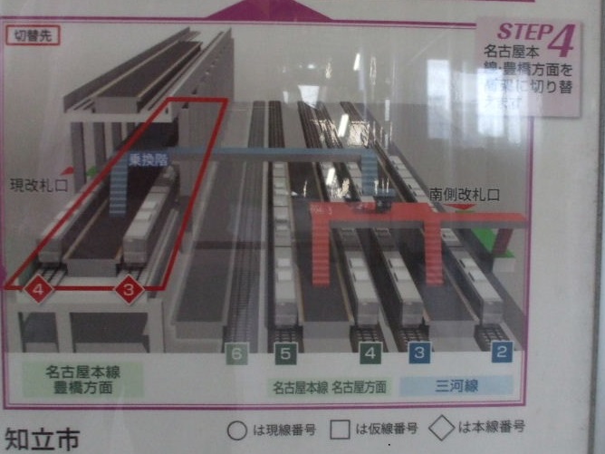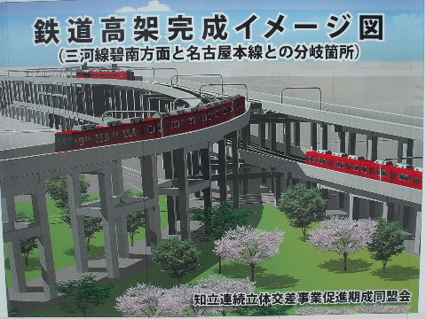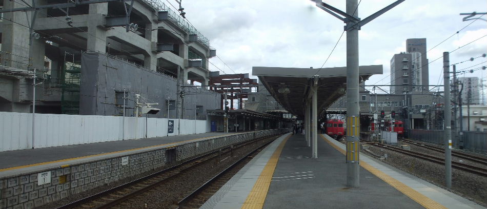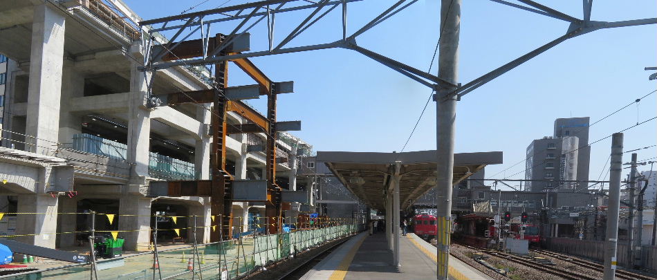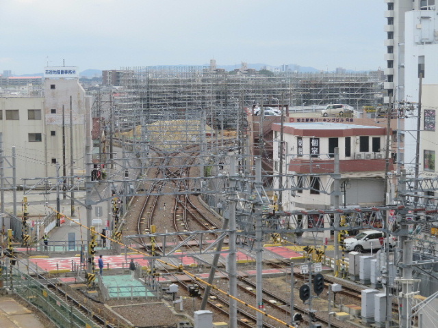 仮線工事が始まっている名鉄知立駅の高架化工事を見物します。駅施設が1階、名古屋本線ホームが2階で2面4線、三河線ホームが3階で2面4線という構造になるようです。 |