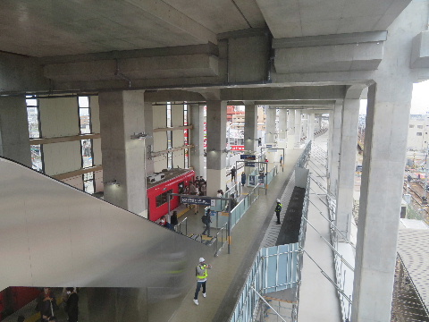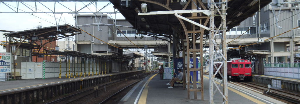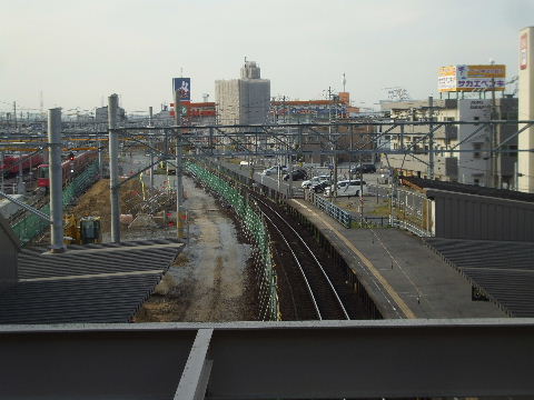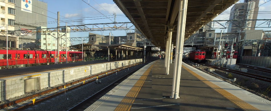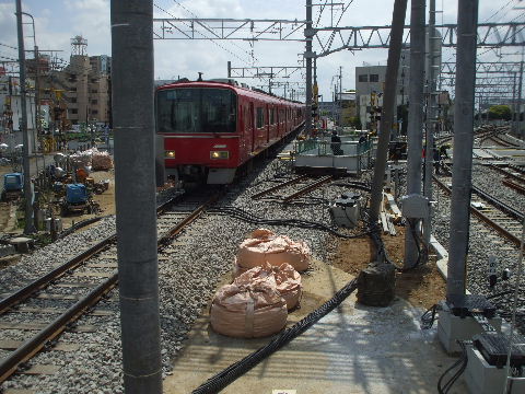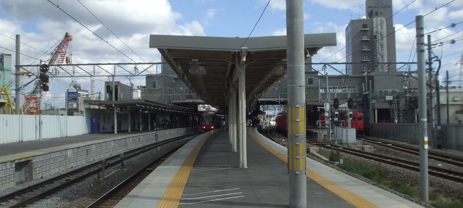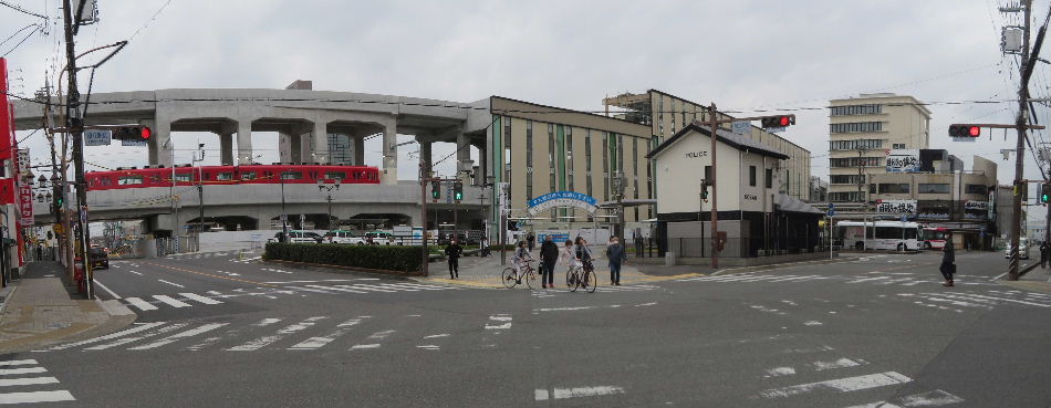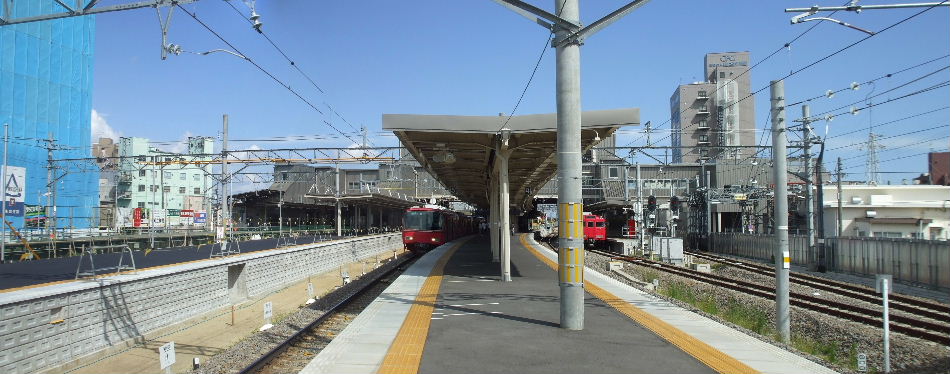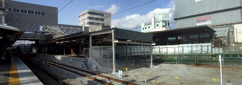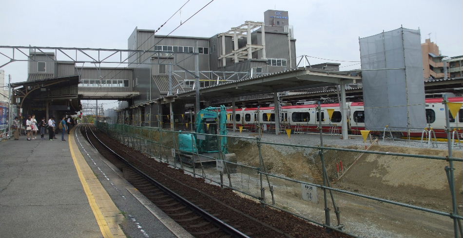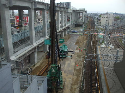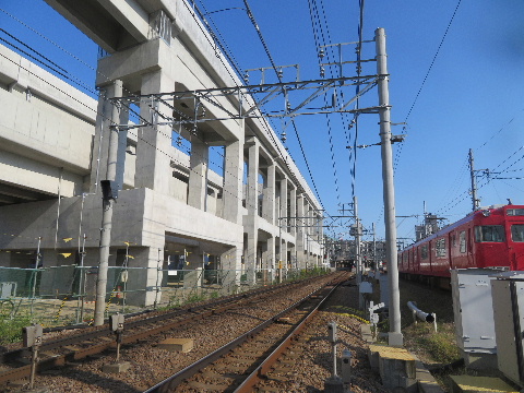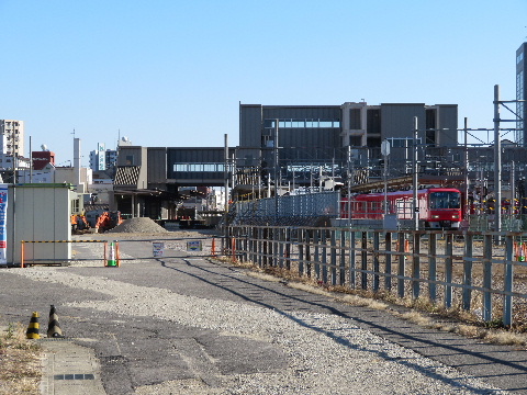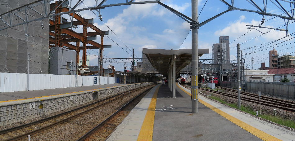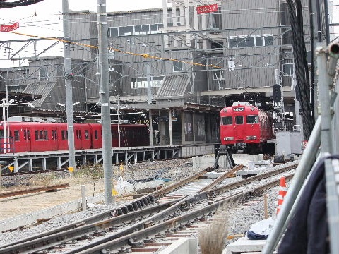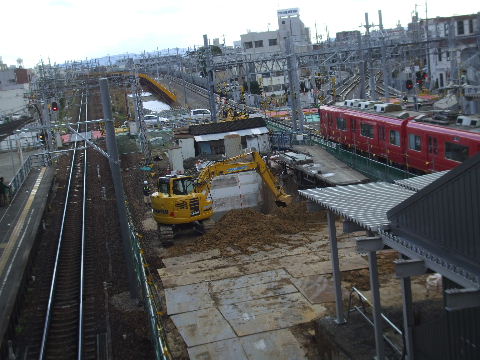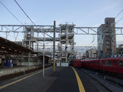 仮線工事が始まっている名鉄知立駅の高架化工事を見物します。駅施設が1階、名古屋本線ホームが2階で2面4線、三河線ホームが3階で2面4線という構造になるようです。 |