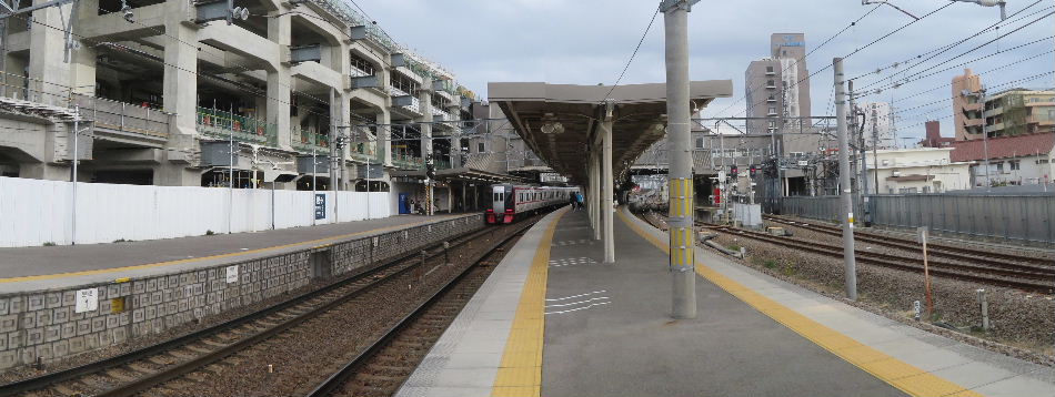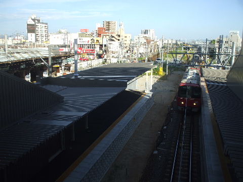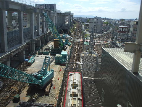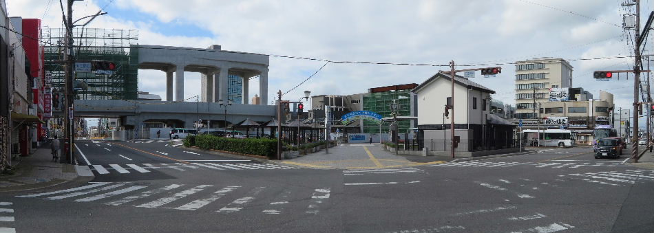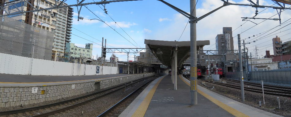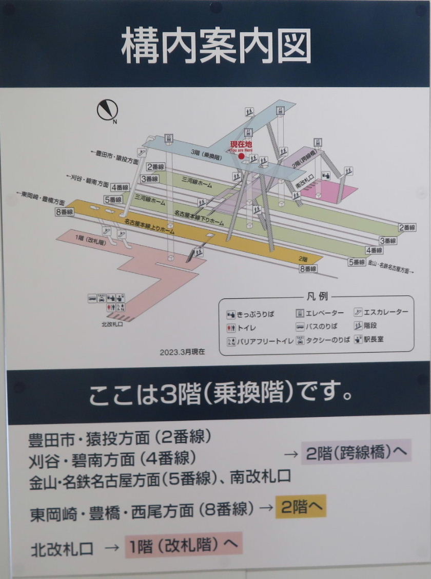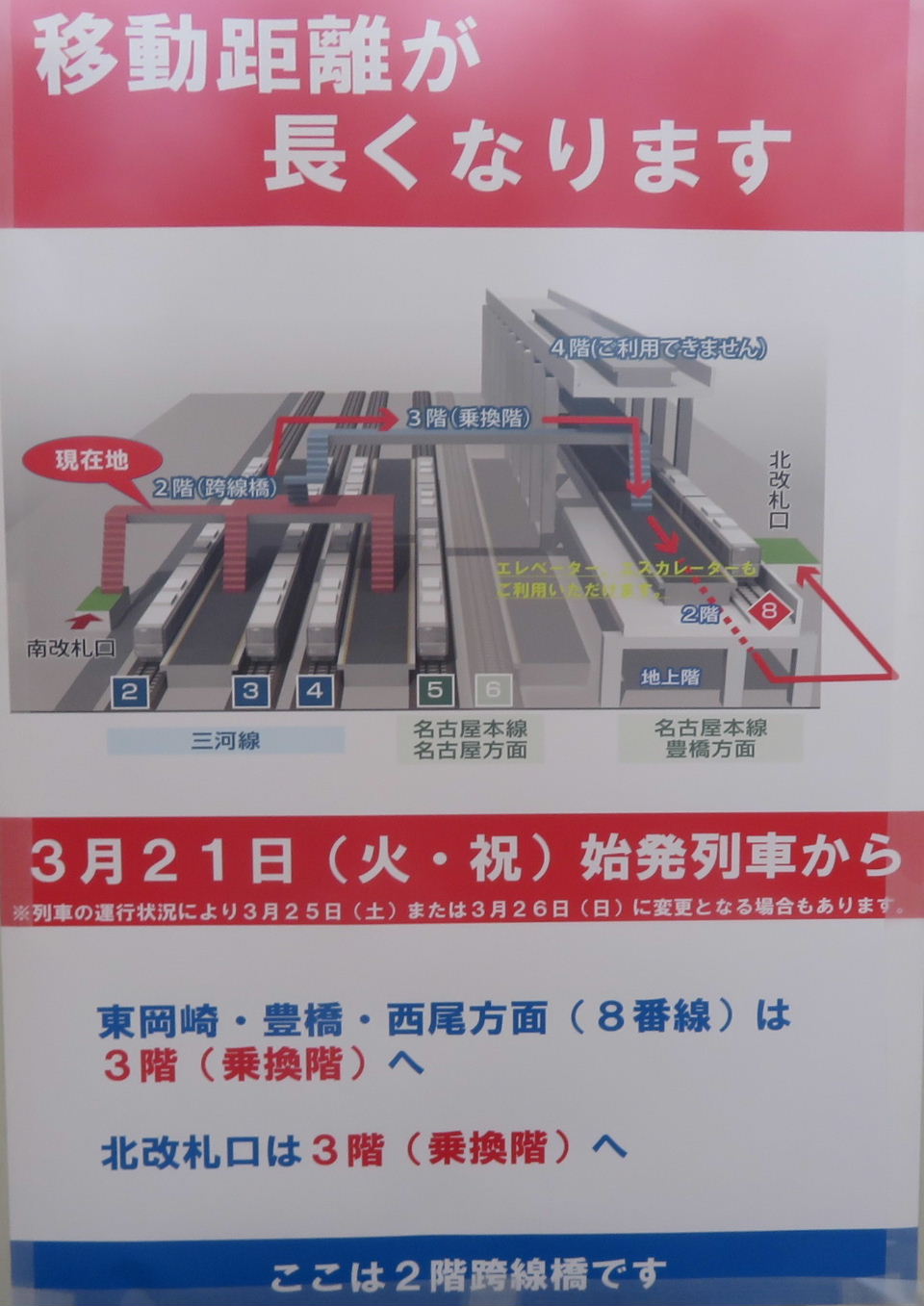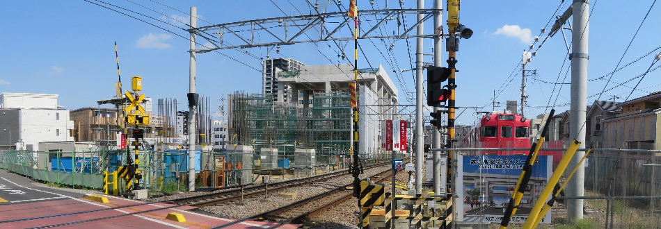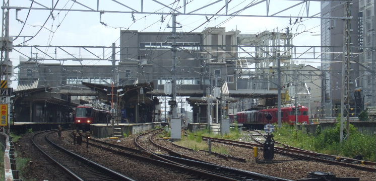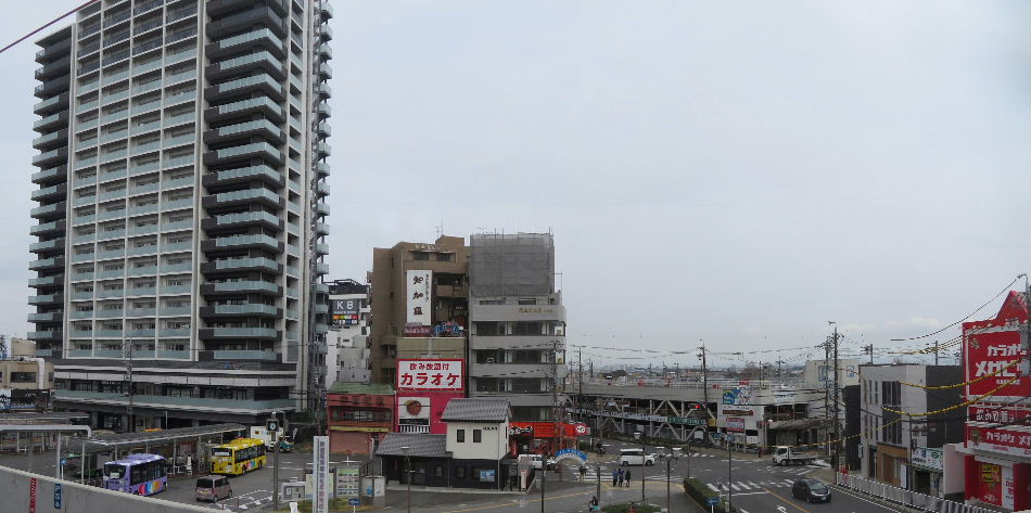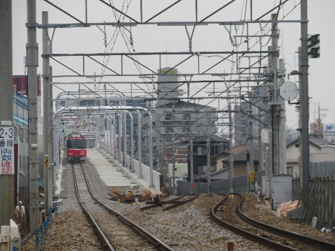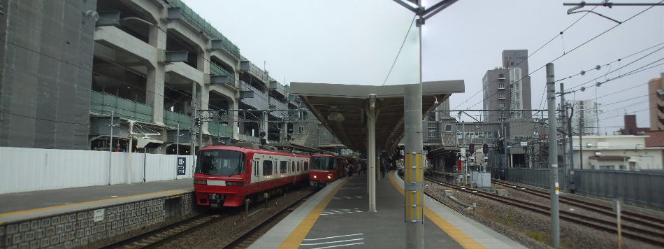 仮線工事が始まっている名鉄知立駅の高架化工事を見物します。駅施設が1階、名古屋本線ホームが2階で2面4線、三河線ホームが3階で2面4線という構造になるようです。 |