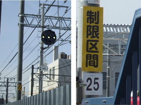 | 2015年02月01日。車内から仮線合流点を見る。架線も張られている。 | 2015年02月01日。信号機。右のは明後日の方向を向いている。 |