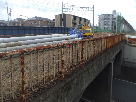 | 2017年11月04日。重機が入って工事中。 | 2017年11月04日。南から見る。いつの間にか旧下り鉄橋のなくなっ ている155号線の向こうに重機が見える。 |