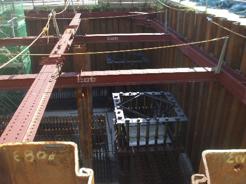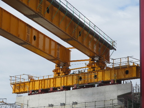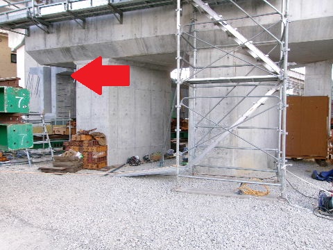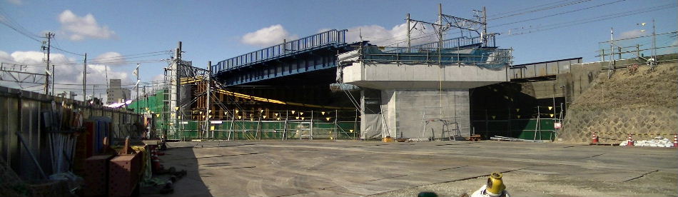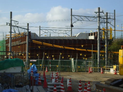 | 2014年10月26日。仮線用の架線柱立つ。 | 2014年11月29日。ビームつく。 |
