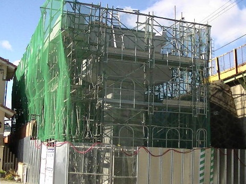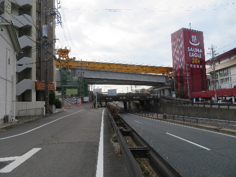| 2020年11月08日。1/2高架橋に残り3/2を付け足す工事中。 | 2020年12月13日。足場を組んで工事が続く。 |