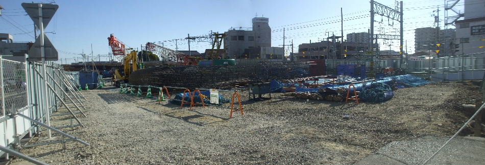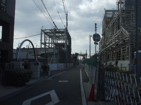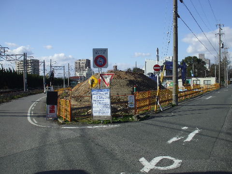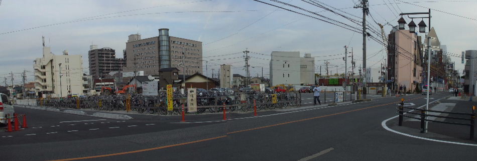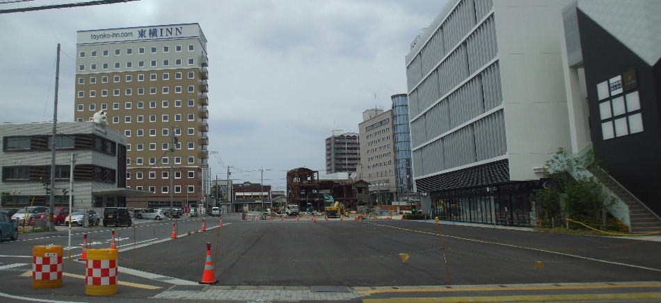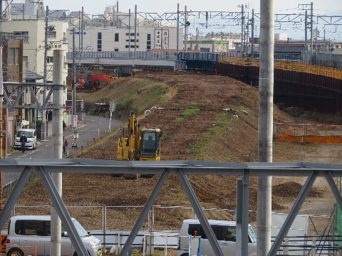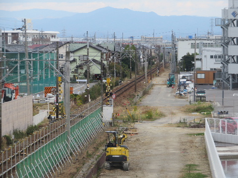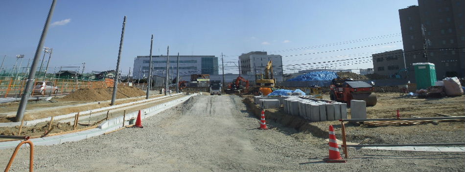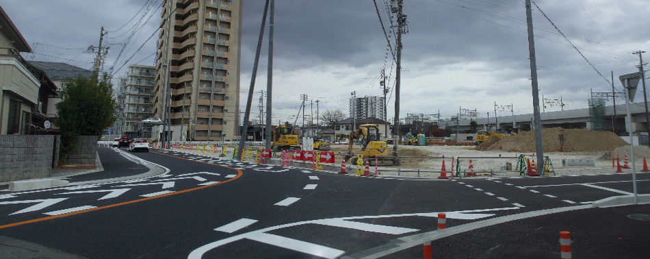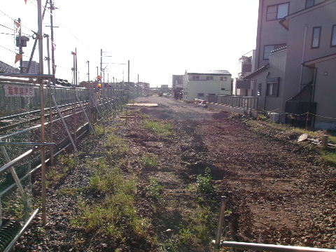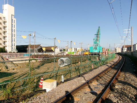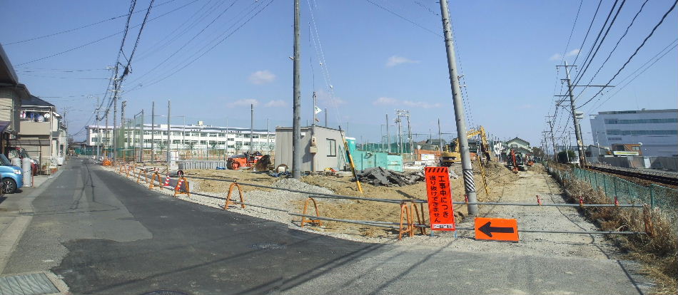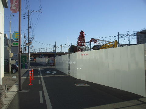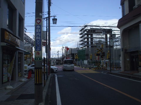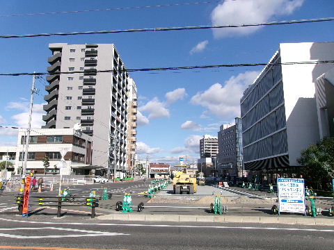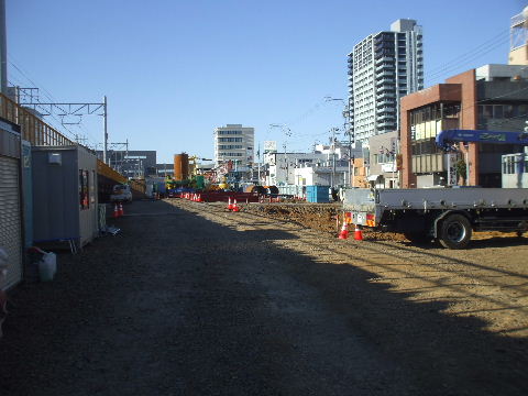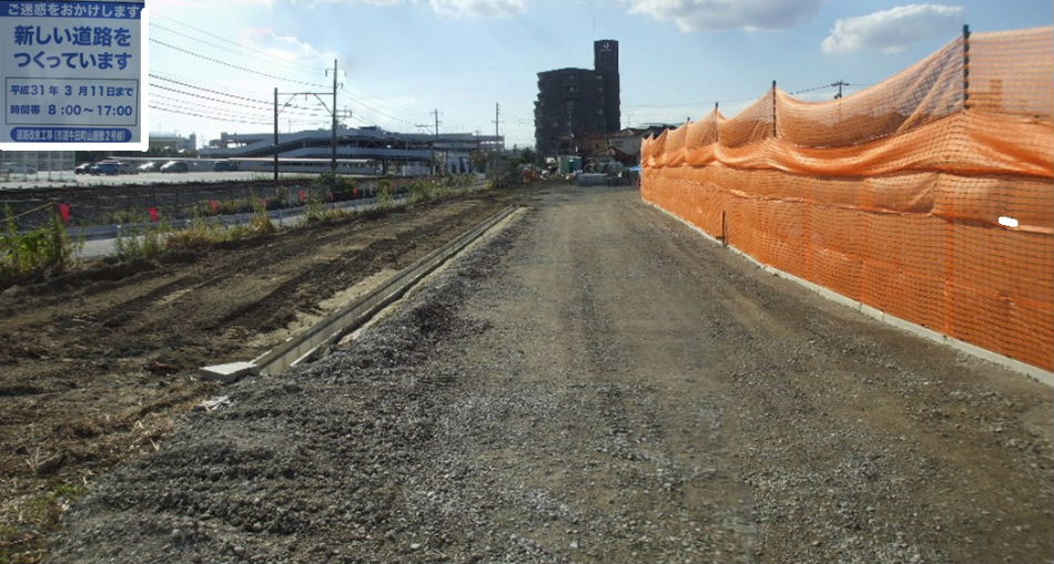 | 2017年11月04日。右側の駅前から北へ線路沿いの道が通行止め になり左側の建物を撤去した跡に新しい道路が作られている。 |