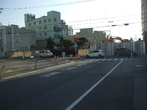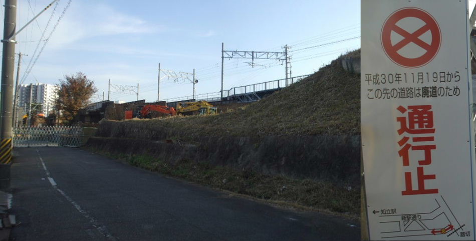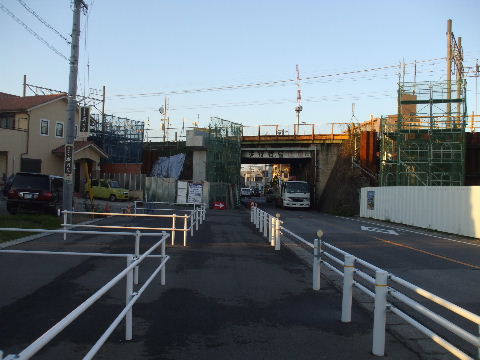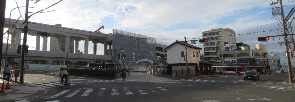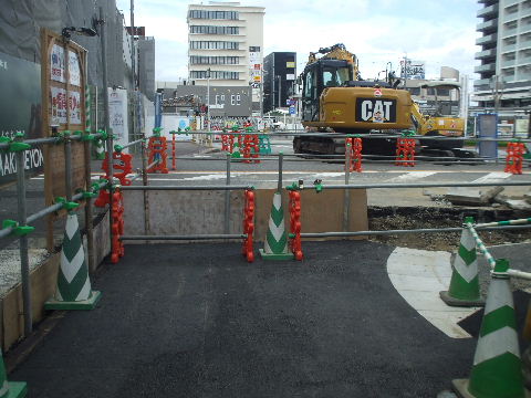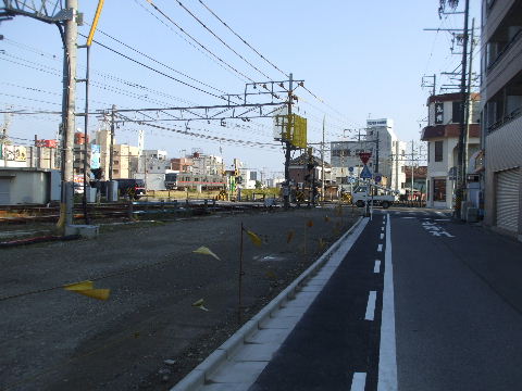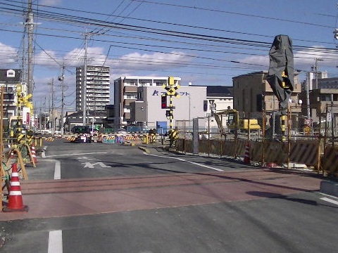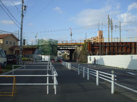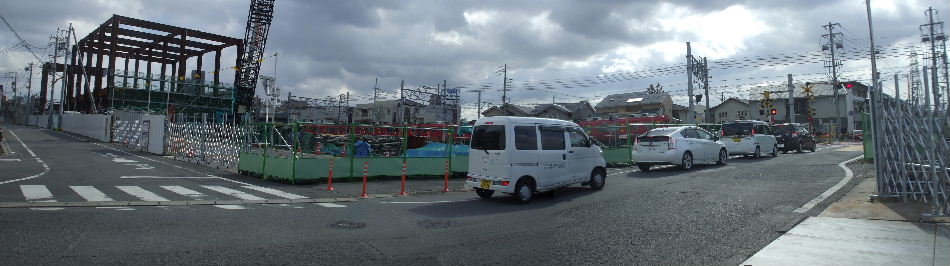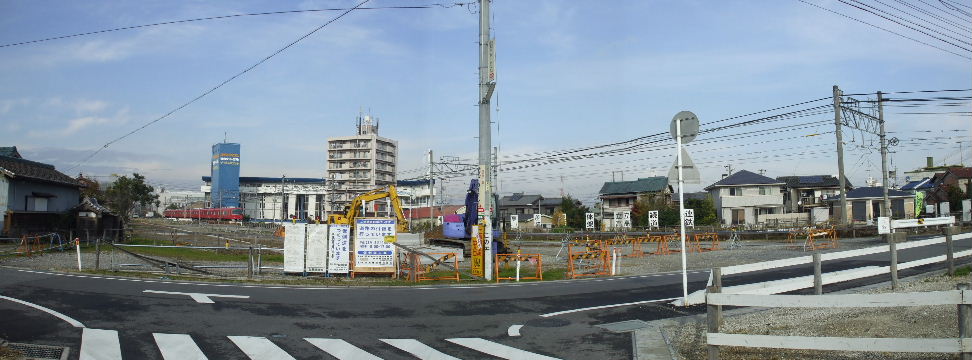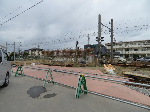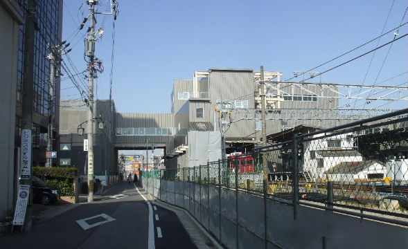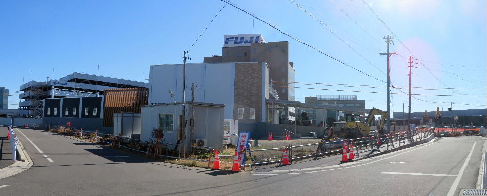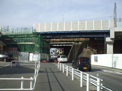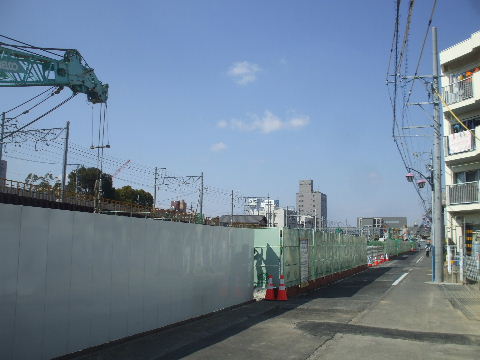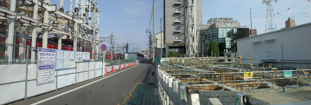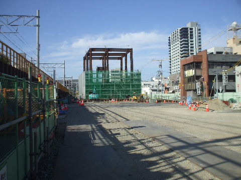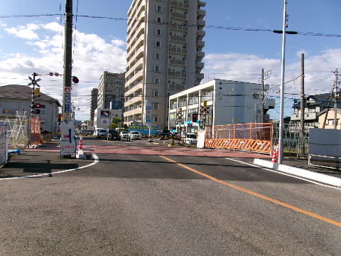 | 2017年11月04日。右側の駅前から北へ線路沿いの道が通行止め になり左側の建物を撤去した跡に新しい道路が作られている。 |