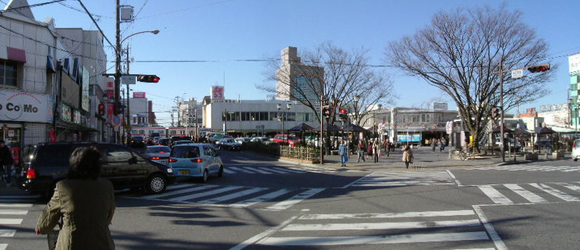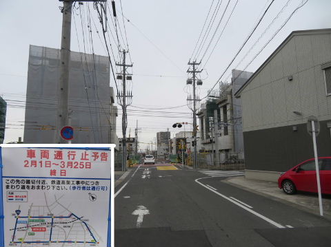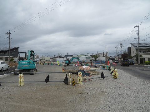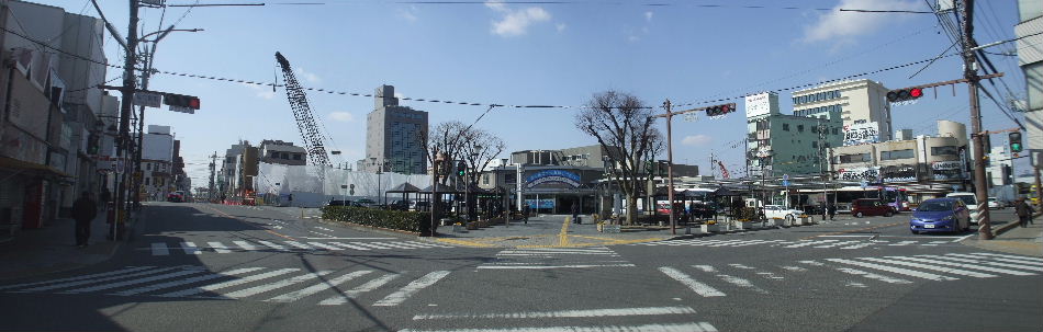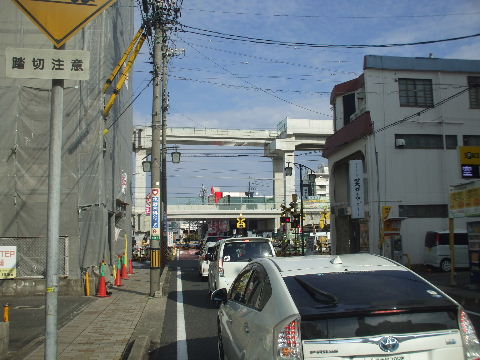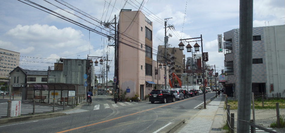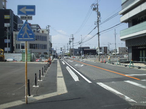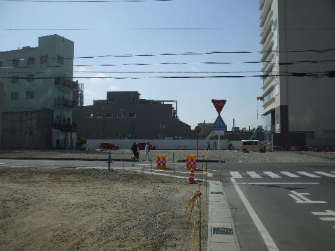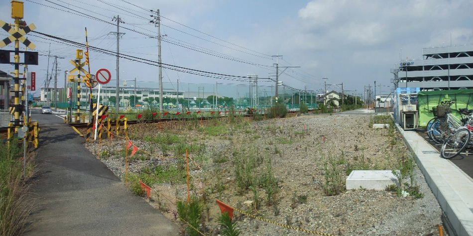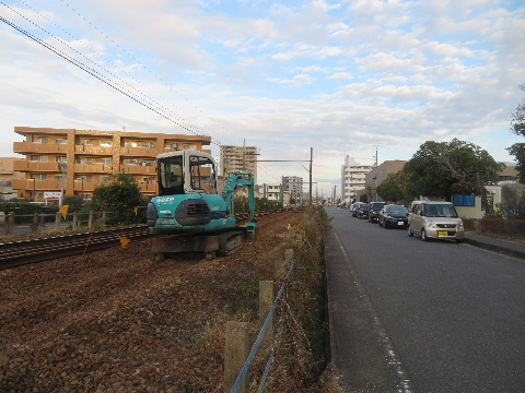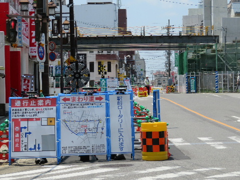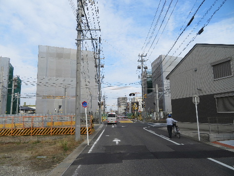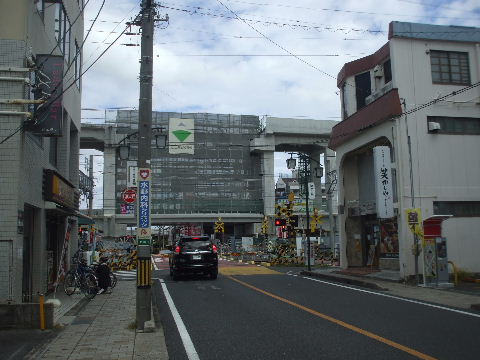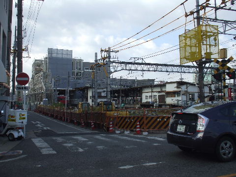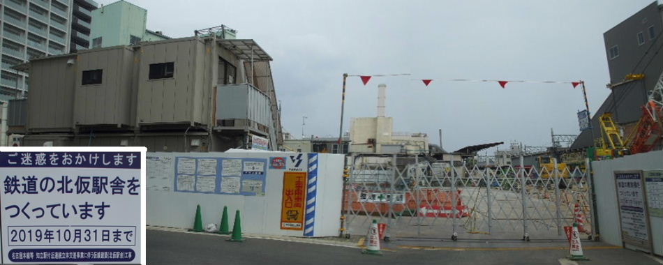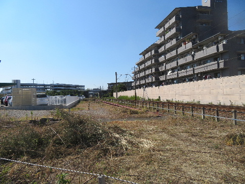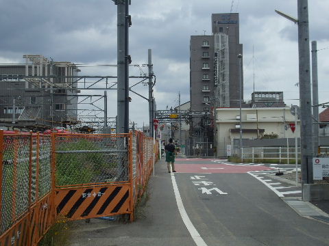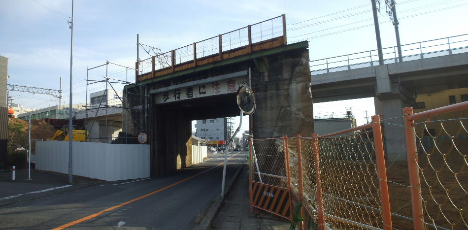 | 2017年11月04日。右側の駅前から北へ線路沿いの道が通行止め になり左側の建物を撤去した跡に新しい道路が作られている。 |